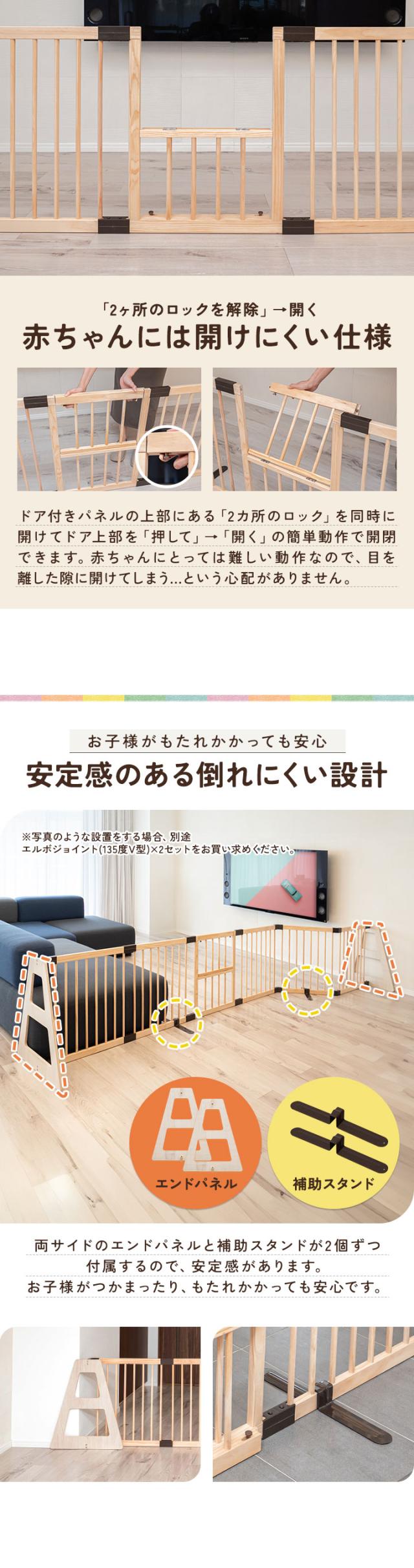 RiZKiZ ベビーフェンス 木製 置くだけ 幅424cm×高さ70cm 最大幅480cm ハイタイプ 扉付き パネル 8枚 幅60cm 自立スタンド付き 組立簡単 組み替え テレビ 階段 ベビーゲート ベビーサークル プレイヤード 安全 倒れにくい 1年保証 送料無料