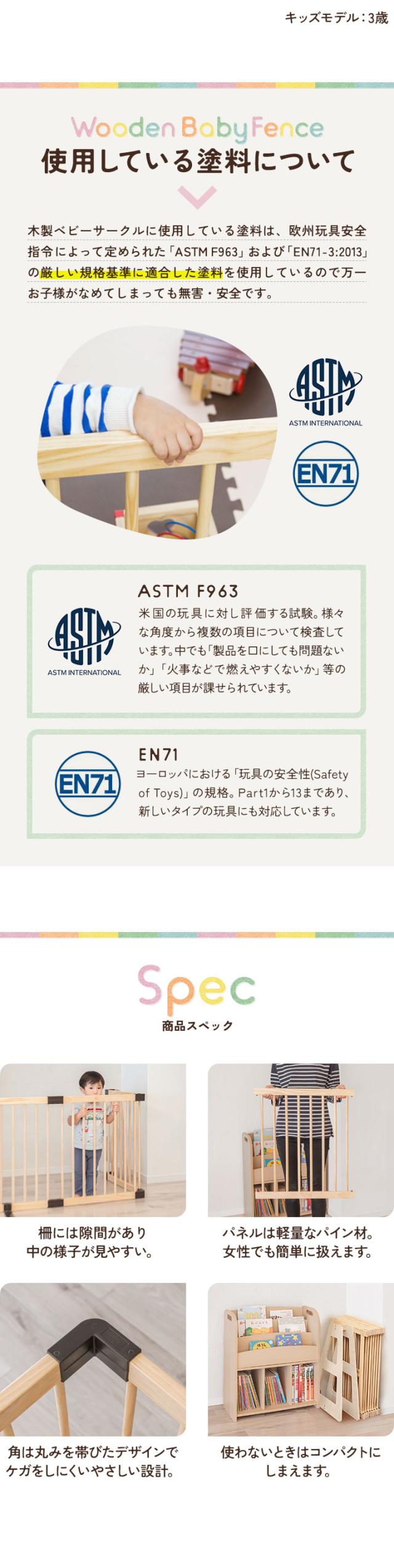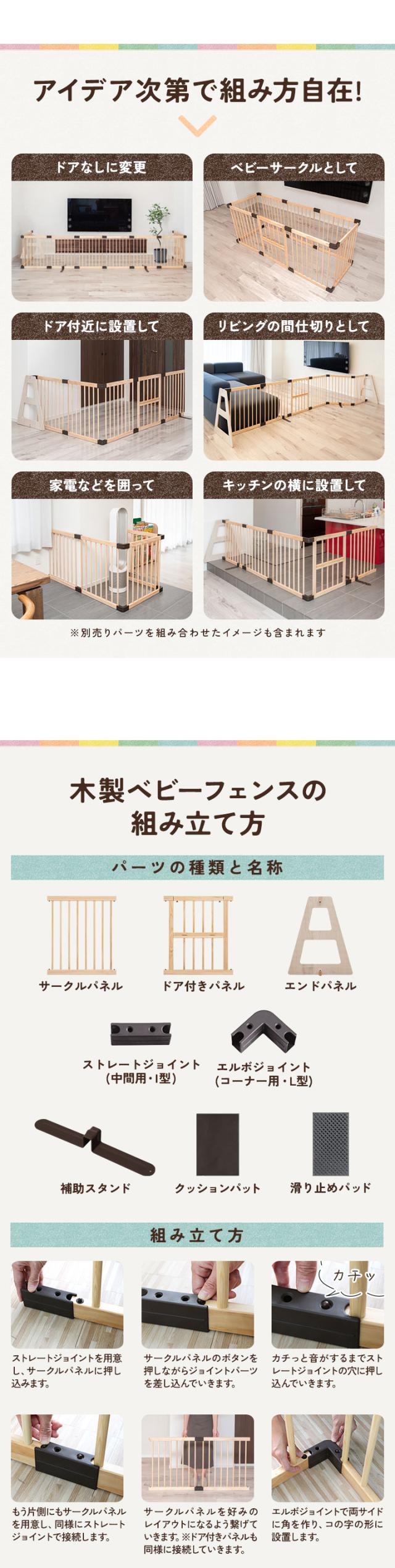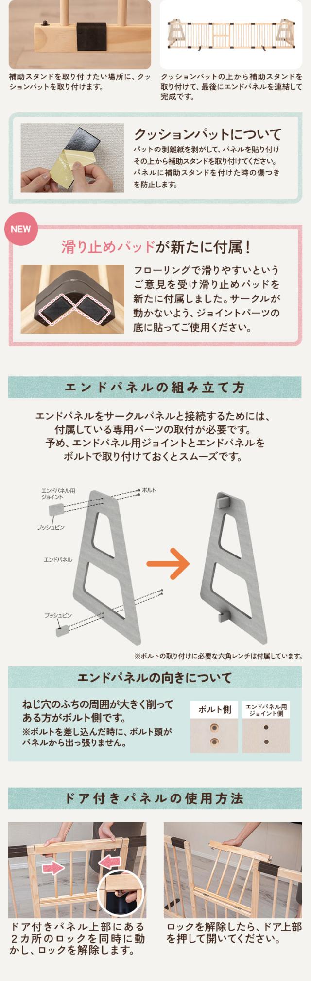 | 材質: ・サークルパネル…パイン材(松の木) ・ジョイントパーツ…PP樹脂 ・エンドパネル…プライウッド ・補助スタンド…スチール |