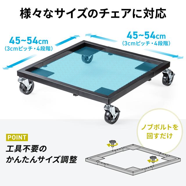 ●対応サイズは、縦・横45〜54cm(3cmピッチで4段階)の幅調整が可能で幅広いスタッキンチェアに対応できます。