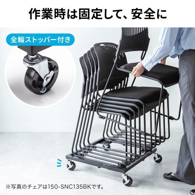 ●スタッキングチェアを載せることができる、キャスター付き台車です。●最大6台まで積載可能で、総耐荷重は50kgまで対応しています。