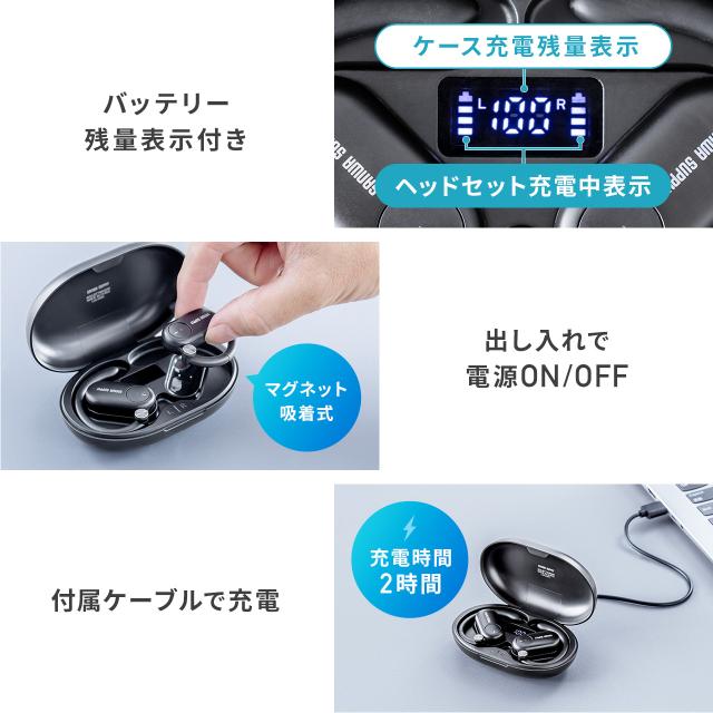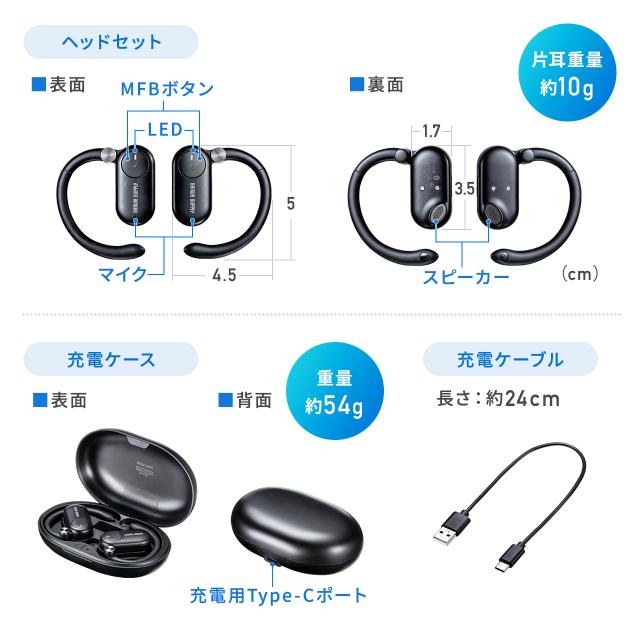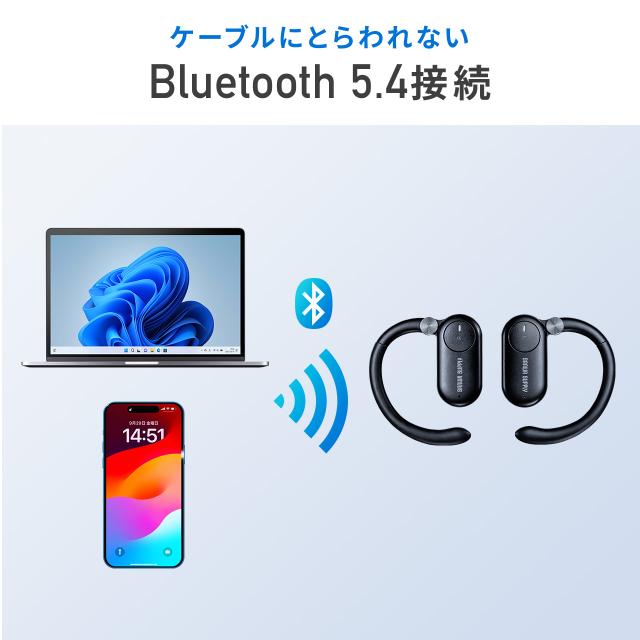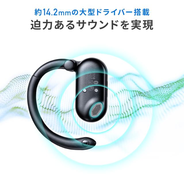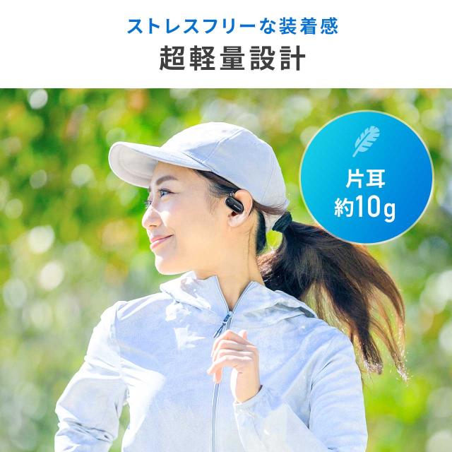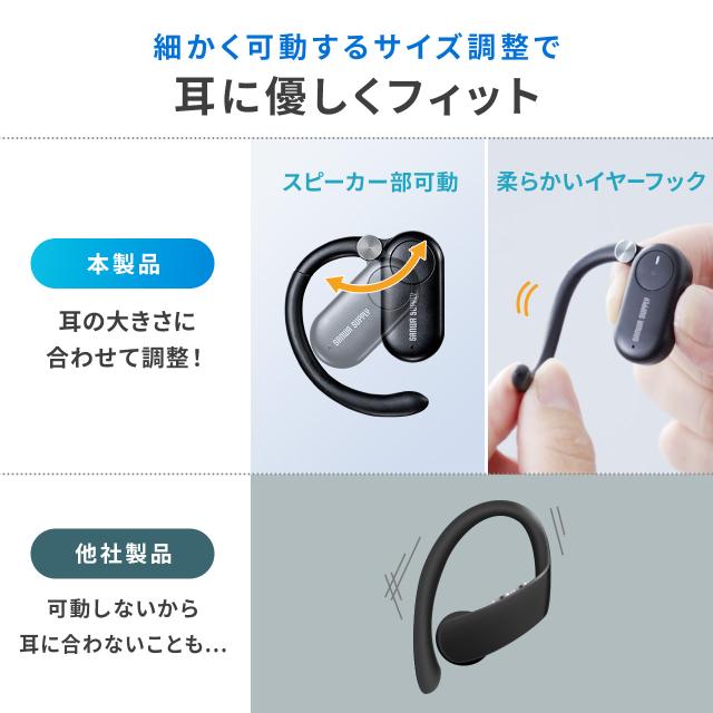オープンイヤー型 ワイヤレスイヤホン Bluetooth5.4 IPX5 防水 空気伝導 Type-C充電 耳掛け式 サイズ調整可能 耳を塞がない 開放型 ヘッドセット 軽量10g ブラック[400-BTTWS5BK]