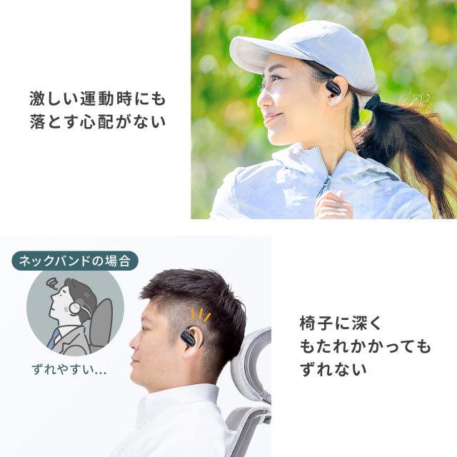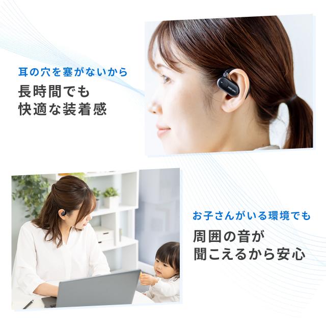 ●周囲の音を聞きながら音楽や通話が楽しめるオープンイヤー型のBluetoothヘッドセットです。●耳をふさがずに聴くことができる空気伝導式なので、周囲の音が聞こえて安心です。