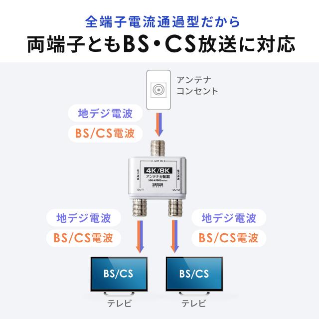 ●1つのアンテナコンセントからの信号を2分配して、2台のテレビやレコーダーに接続するための分配器です。●地デジ、BS、110度CS放送に加えて4K8K放送にも対応しています。