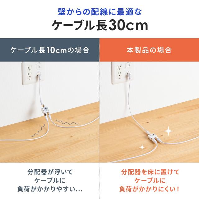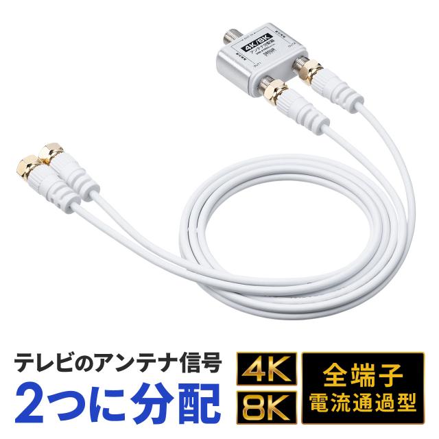 アンテナ分配器 4K対応 8K対応 BS/CS/地デジ/CATV対応 2分配器 出力ケーブル付き ケーブル長1m[500-AT005-OUT1]