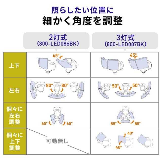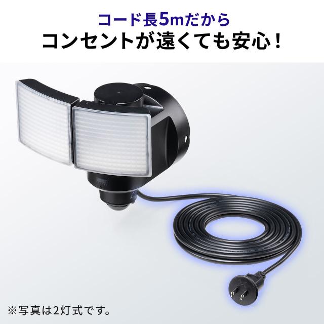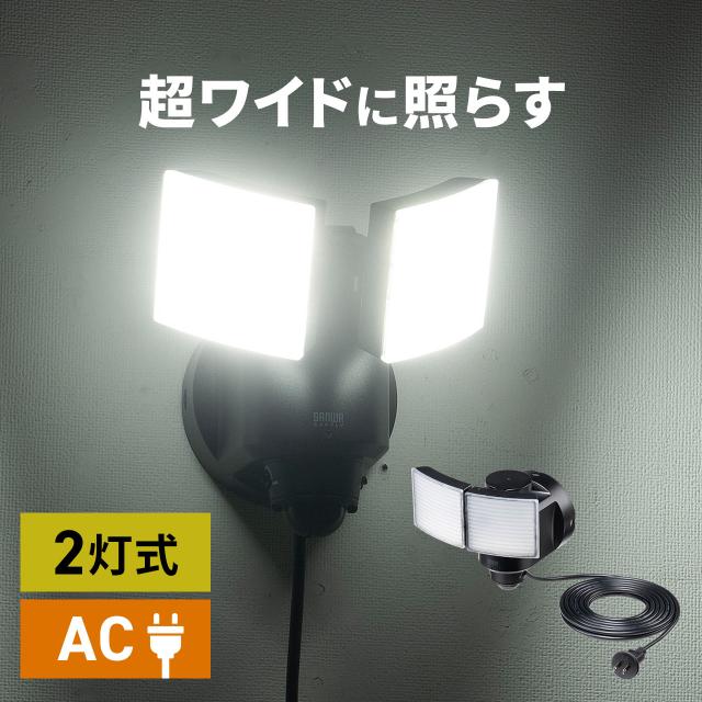 センサーライト 屋外 LED コンセント 防水 2灯 5m 人感センサー 100V 角度調整 1200ルーメン[800-LED086BK]
