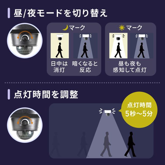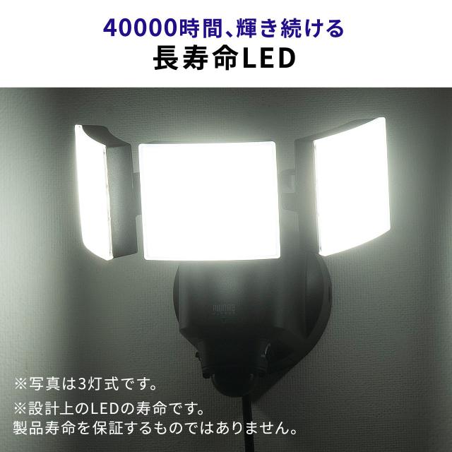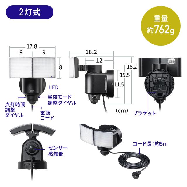 ●家庭用コンセントの電源を使用した屋内・屋外で使用できる2灯のセンサーLEDライトです。●センサーを搭載し、感知してライトを点灯させることができます。