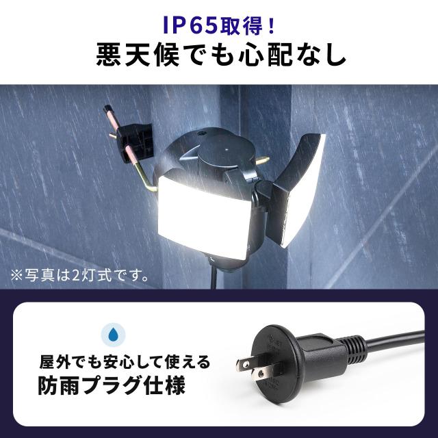 ⇒ご購入の前にご確認下さい2灯、1200ルーメン。防雨コンセントで屋外でも使用できるIP65仕様。センサーで反応し点灯。防犯対策としても使用できるLEDセンサーライト。角度調整も可能。ネジ固定、クランプ固定も可能。【WEB限定商品】