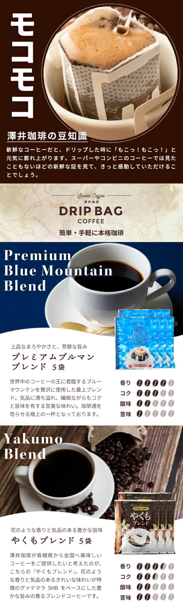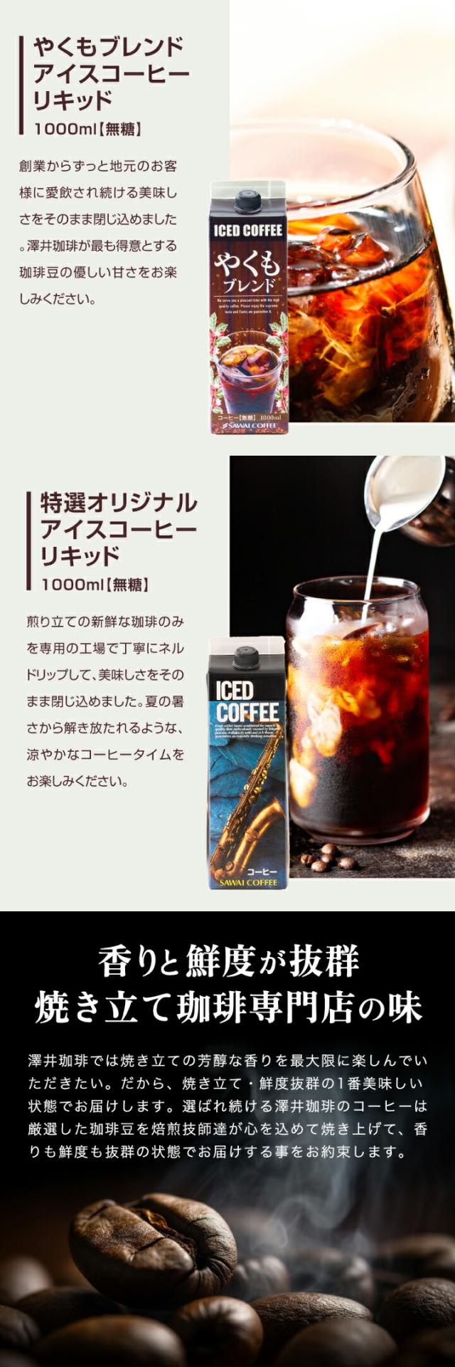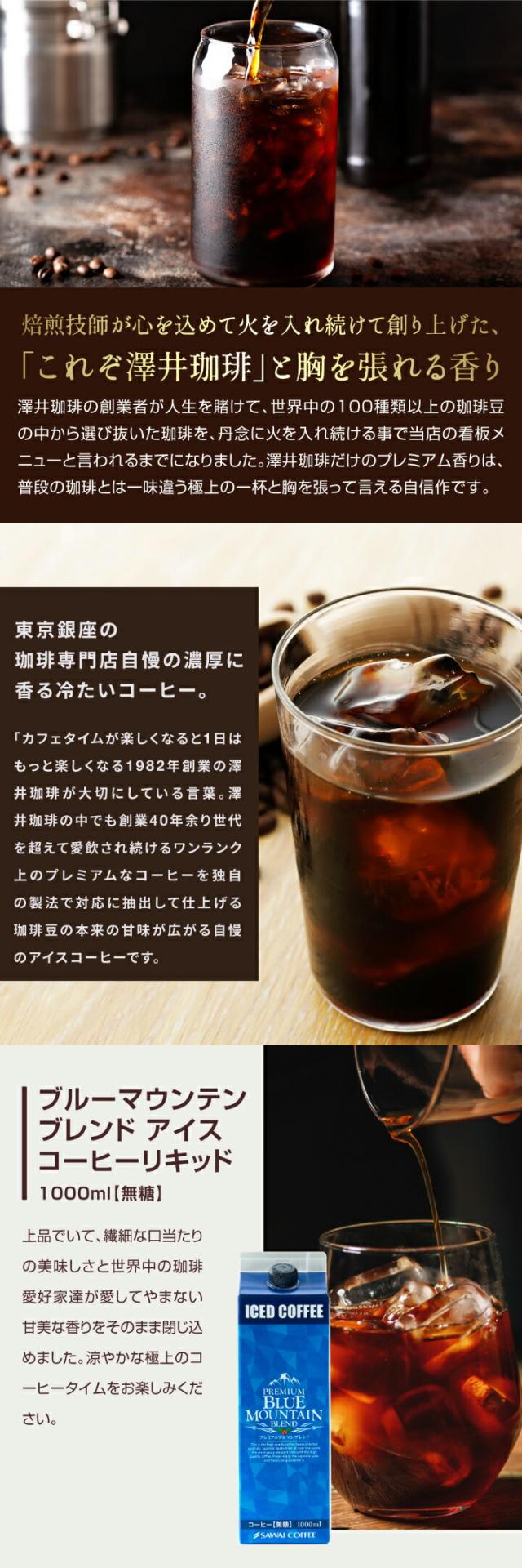 アイスコーヒーリキッドブルーマウンテンブレンドアイスコーヒーリキッド 1000ml【無糖】上品でいて、繊細な口当たりの美味しさと世界中の珈琲愛好家達が愛してやまない甘美な香りをそのまま閉じ込めました。 涼やかな極上のコーヒータイムをお楽しみください。 やくもブレンドアイスコーヒーリキッド 1000ml【無糖】 創業からずっと地元のお客様に愛飲され続ける美味しさをそのまま閉じ込めました。 澤井珈琲が最も得意とする珈琲豆の優しい甘さをお楽しみください。 特選オリジナルアイスコーヒーリキッド 1000ml【無糖】 煎り立ての新鮮な珈琲のみを専用の工場で丁寧にネルドリップして、美味しさをそのまま閉じ込めました。 夏の暑さから解き放たれるような、涼やかなコーヒータイムをお楽しみください。 ドリップバッグコーヒープレミアムブルマンブレンド 5袋世界中のコーヒーの王に君臨するブルーマウンテンを贅沢に使用した最上ブレンド。 気品に満ち溢れ、繊細ながらもコクと旨味を有する甘美な味わい。珈琲通を唸らせる極上の一杯となっております。 やくもブレンド 5袋 澤井珈琲が島根県から全国へ美味しいコーヒーをご提供したいと考えたのが、こちらの『やくもブレンド』。 花のような香りと気品のあるきれいな味わいが特徴のグァテマラSHBをベースにした豊かな旨味の香るブレンドコーヒーです。 | |