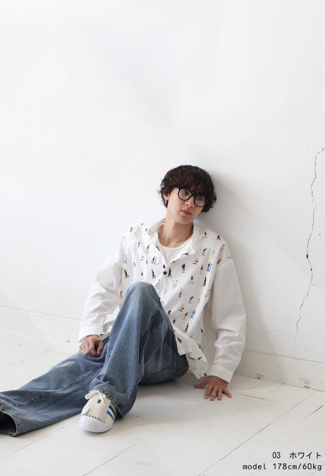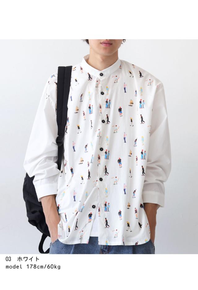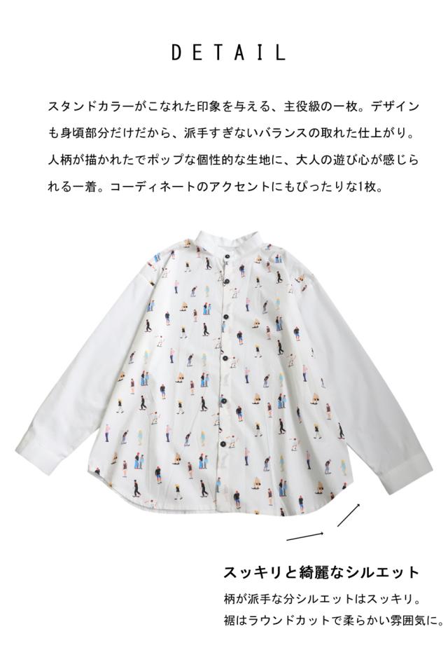 ze-01110z 羽織り スタンドカラー バンドカラー スタンドネック プリント イラスト 絵 柄シャツ 柄 無地 切り替え ドッキング 前開き ボタン 綿 コットン 綿混 ゆったり シンプル