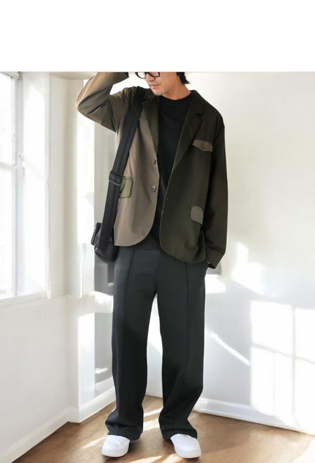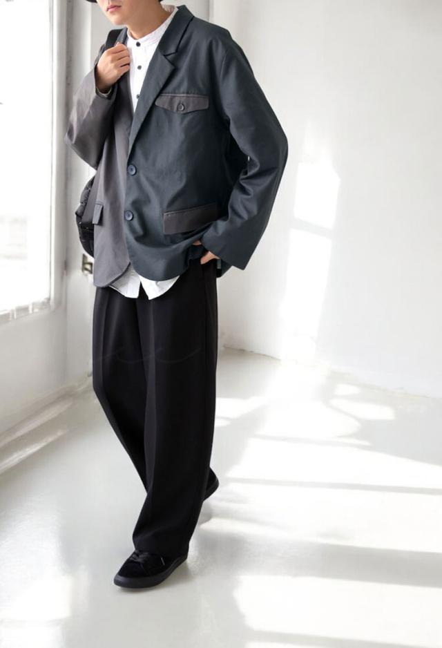 zk-00170z 羽織り 長袖 セットアップ 無地 テーラード 配色 異素材 切り替え 前開き ゆったり シンプル きれいめ 上品 モード 体型カバー 着痩せ 大きめ オケージョン ユニセックス