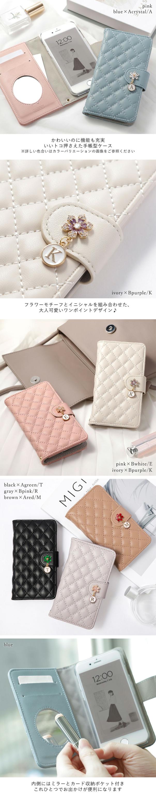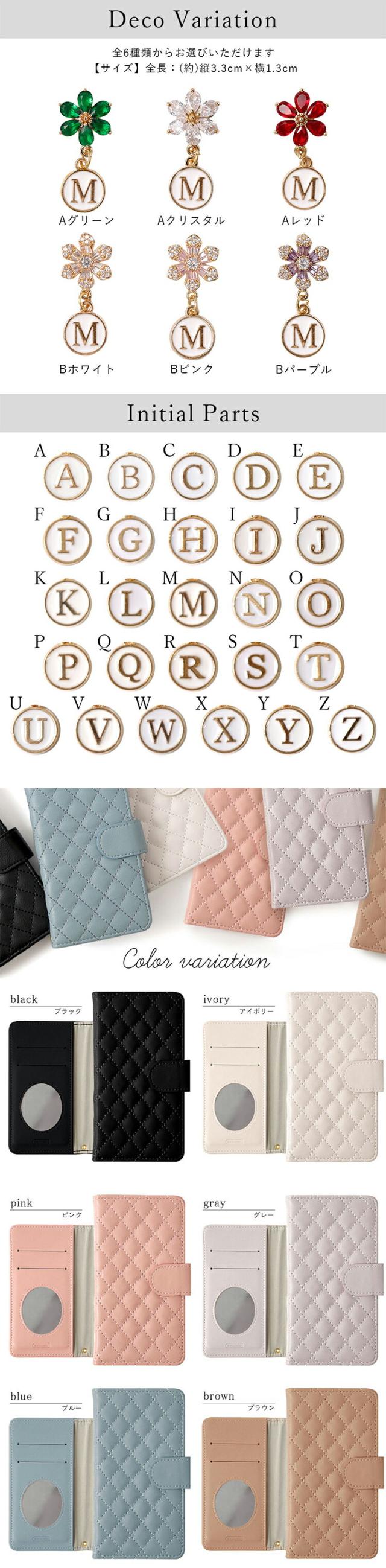 マット素材で高級感のあるキルティング手帳型ケース×イニシャルデコ6種
