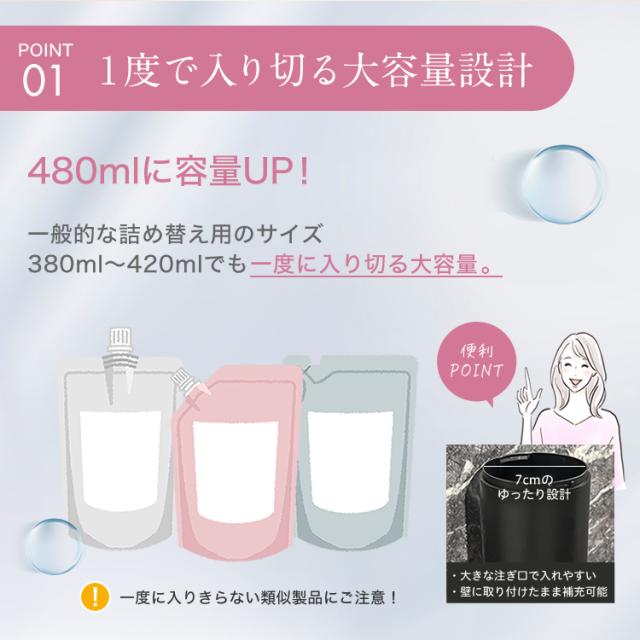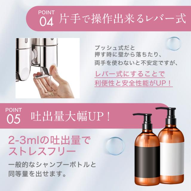 1回で2-3mlの大吐出量にグレードアップ!"shampoo"や"body soap"、"conditioner"など用途によってレバーを引く回数を調整してお使いください。