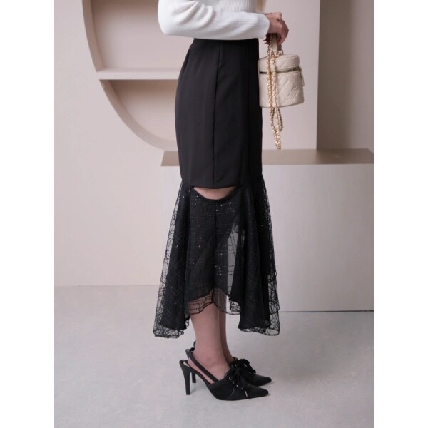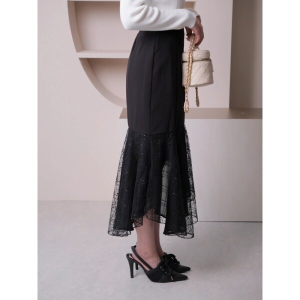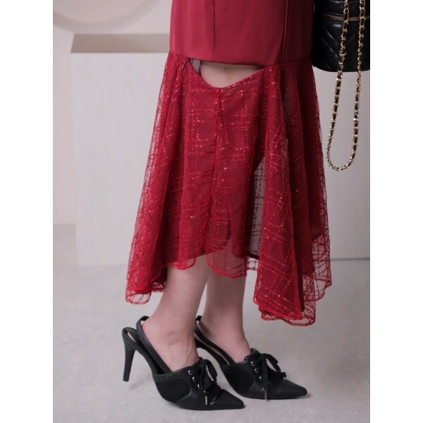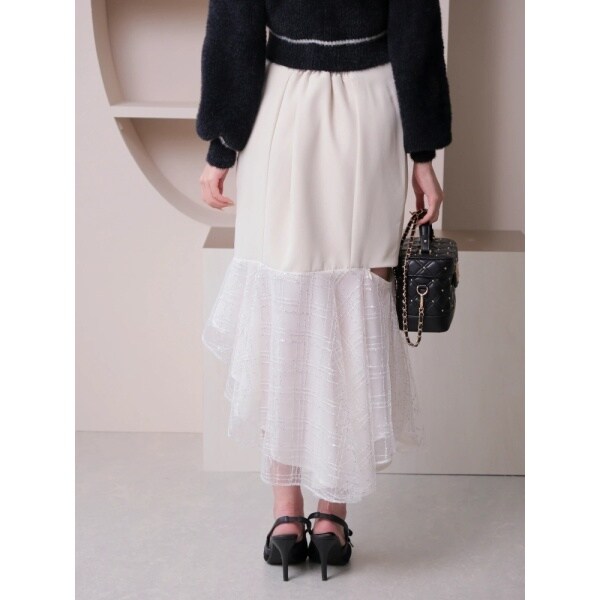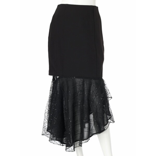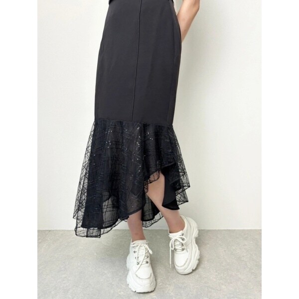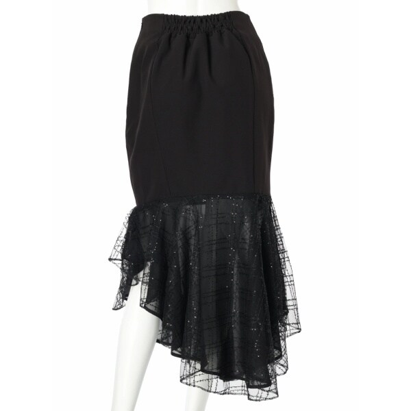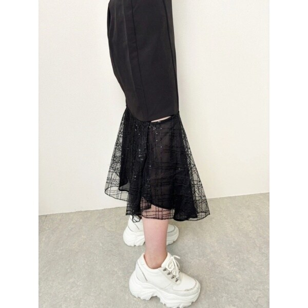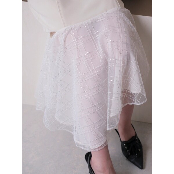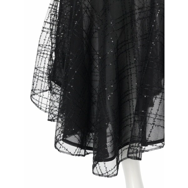・裾のフレア部分はシアーチェックにスパンコールが施された生地で、