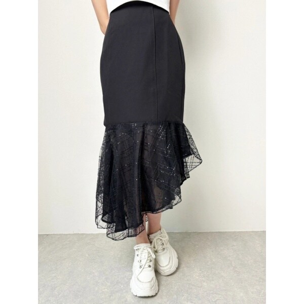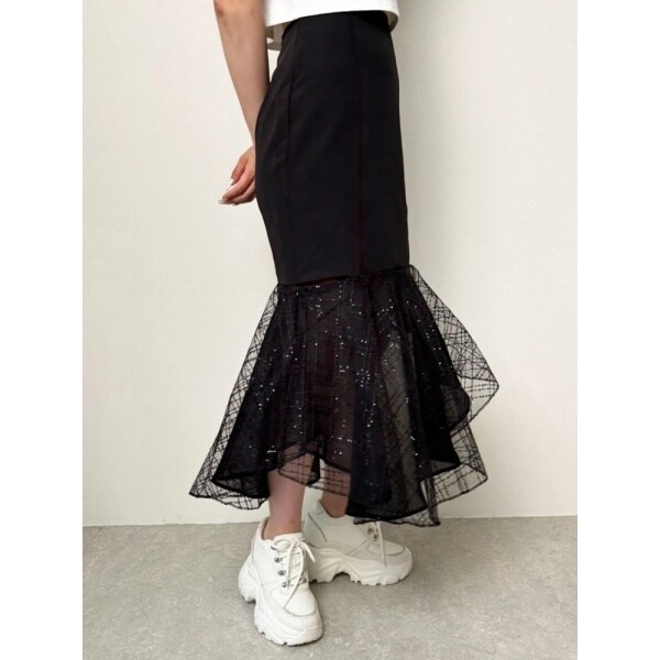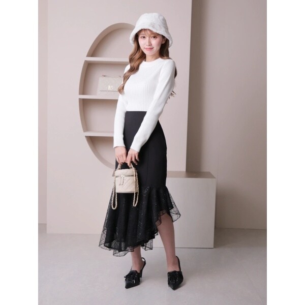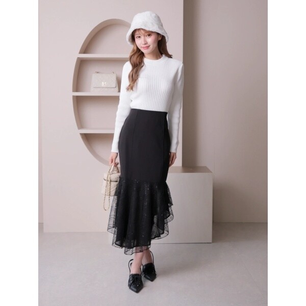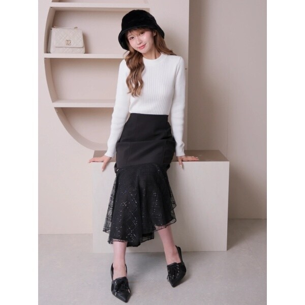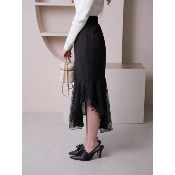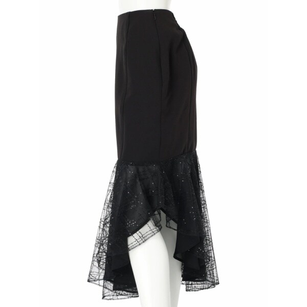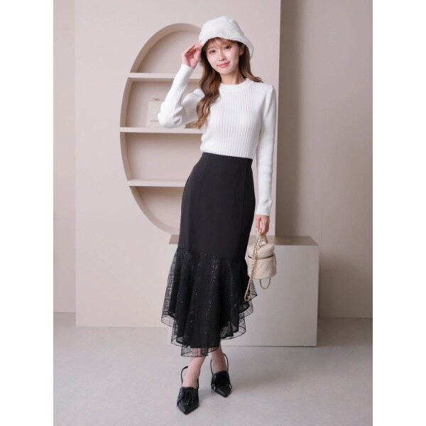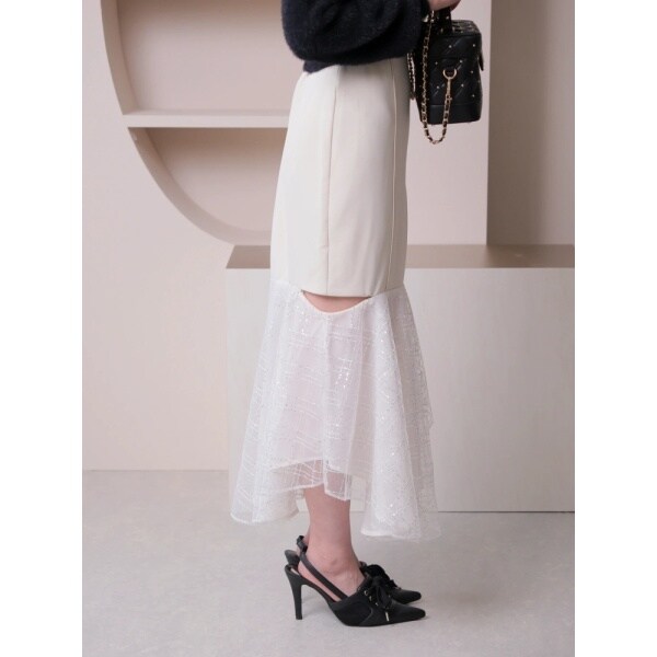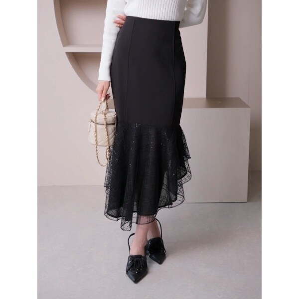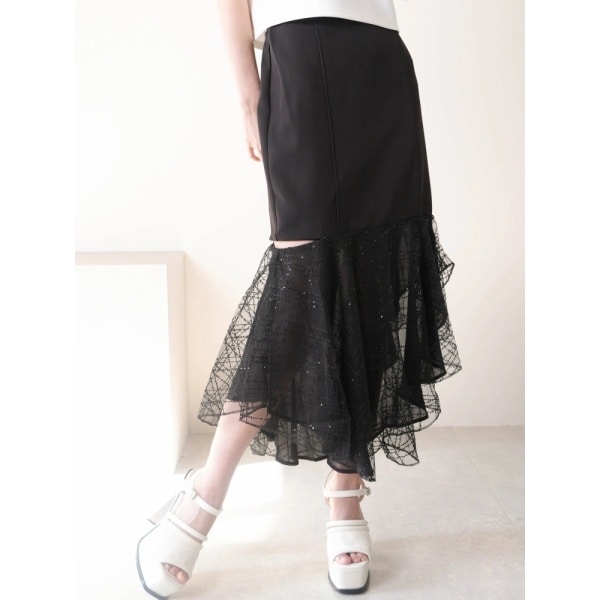 ・裾のフレア部分はシアーチェックにスパンコールが施された生地で、