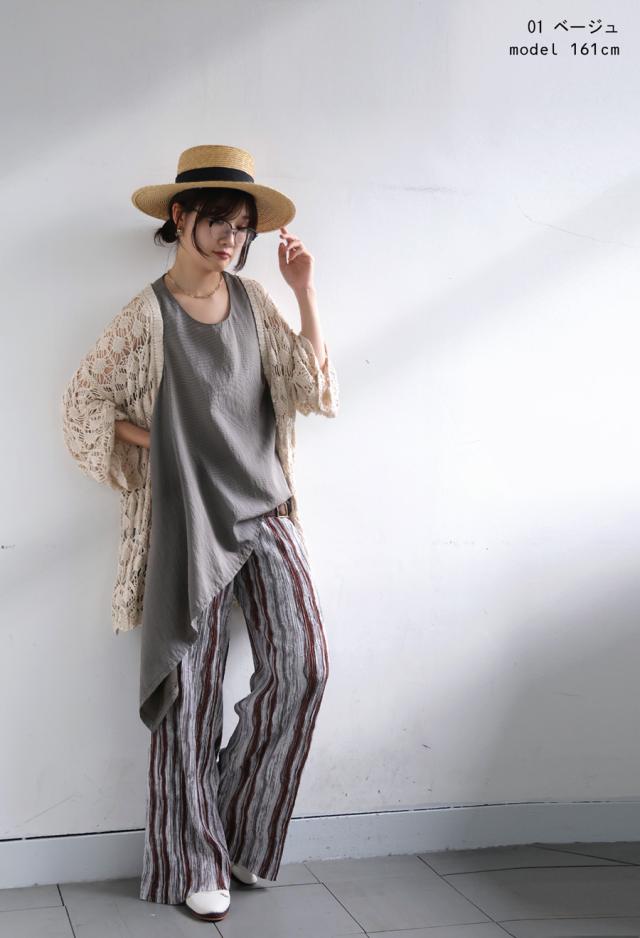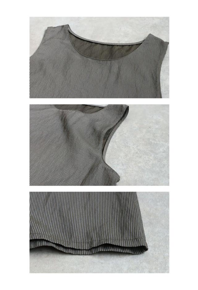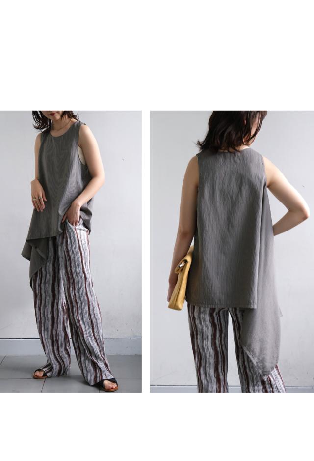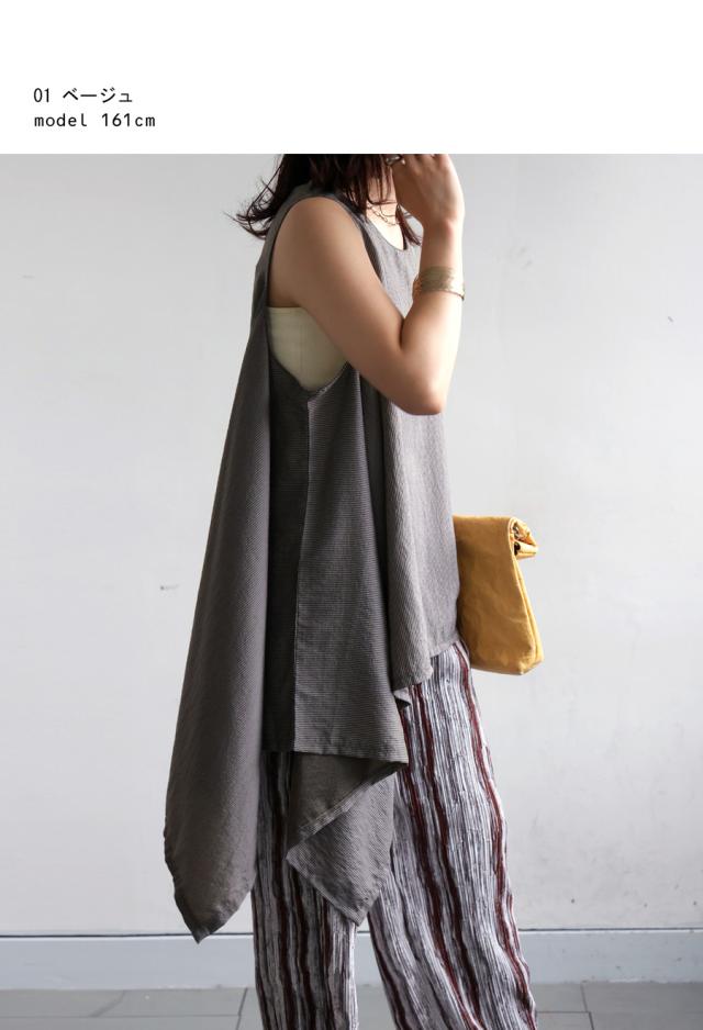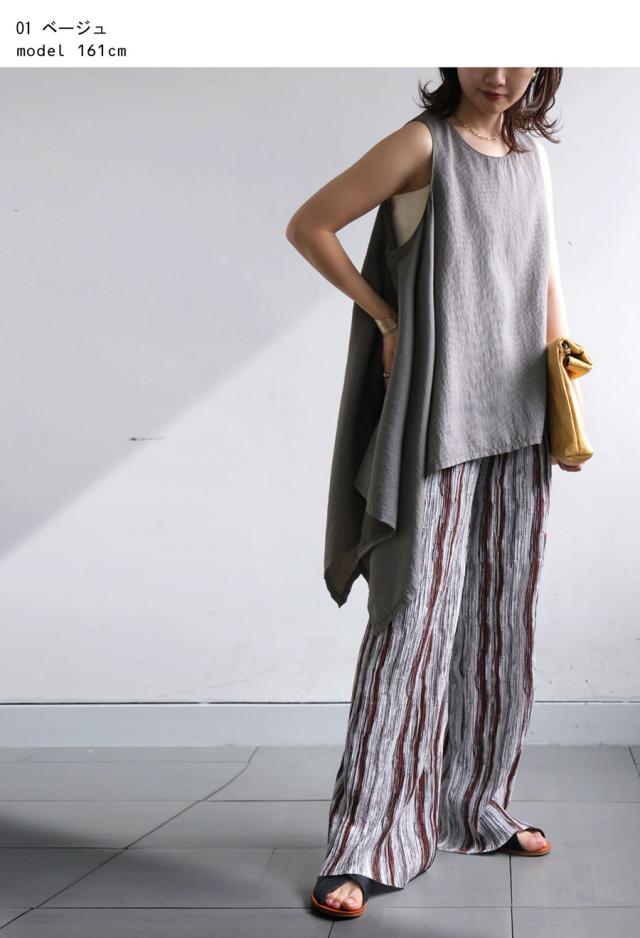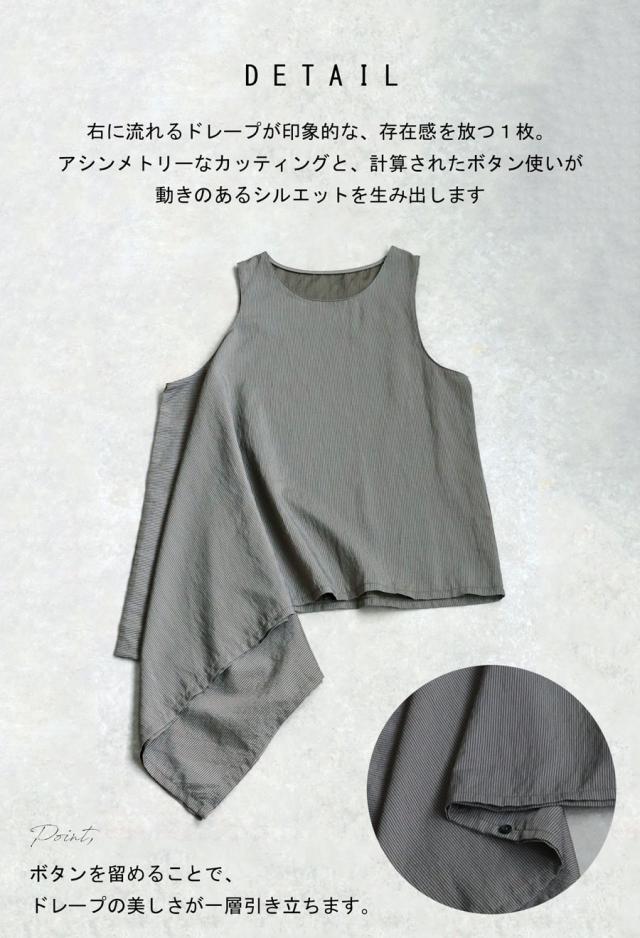 pa-03703 ストライプ柄 柄 立体ドレープ アシンメトリー 軽やか素材 袖なし デザインカット モードシルエット アシンメトリー クルーネック 丸首 プルオーバー かぶり