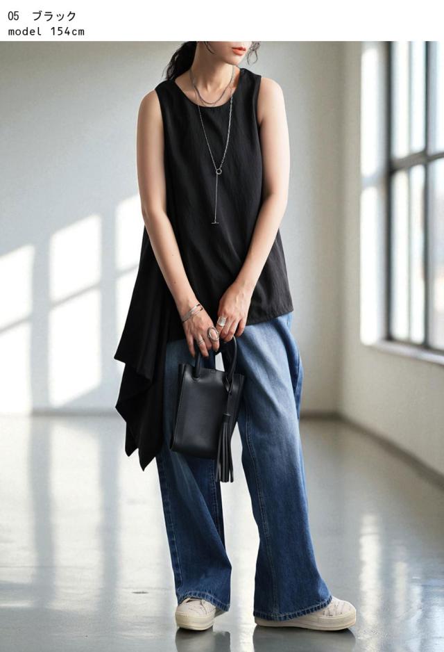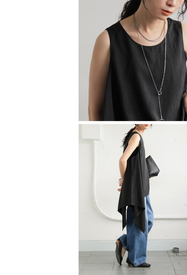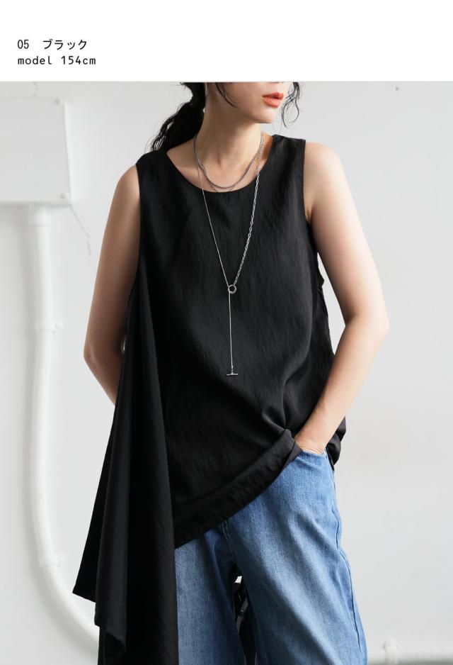 ひと味違う個性を放つ、アシメドレープが魅力のノースリーブタンクトップ。