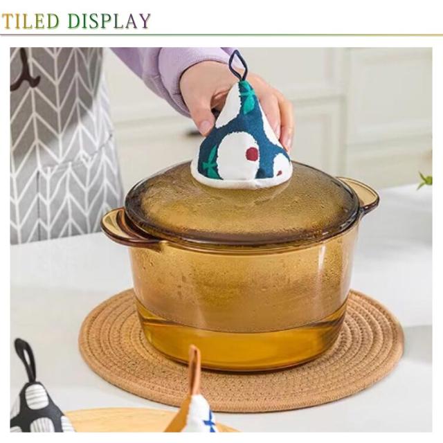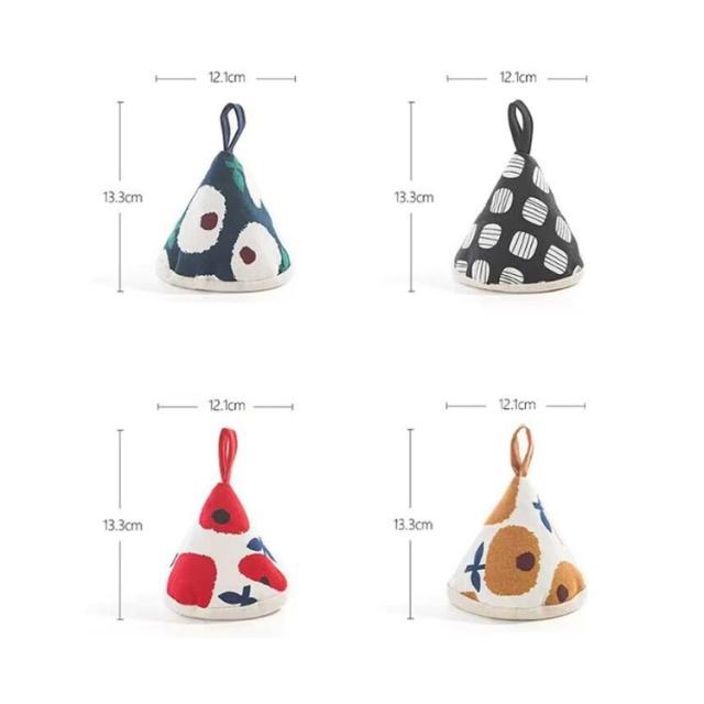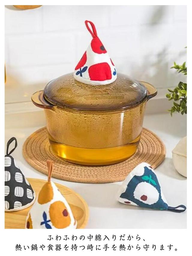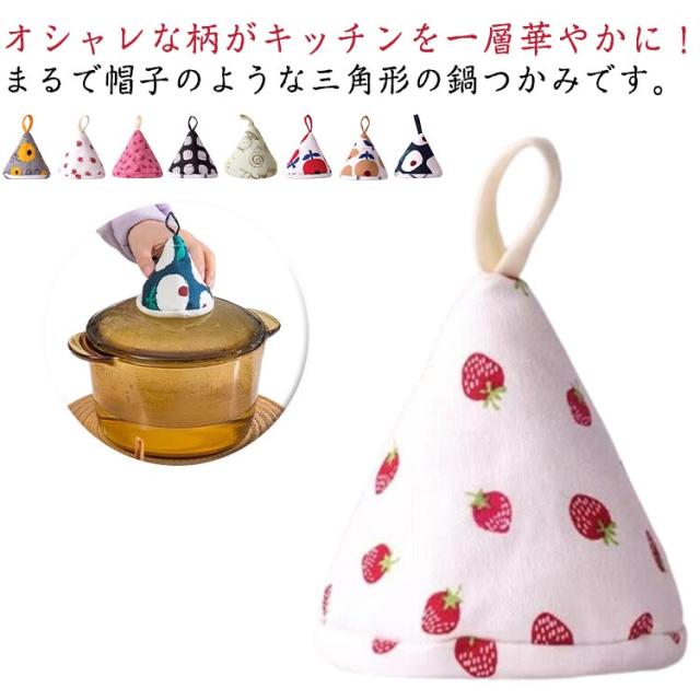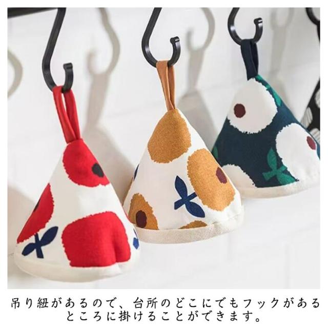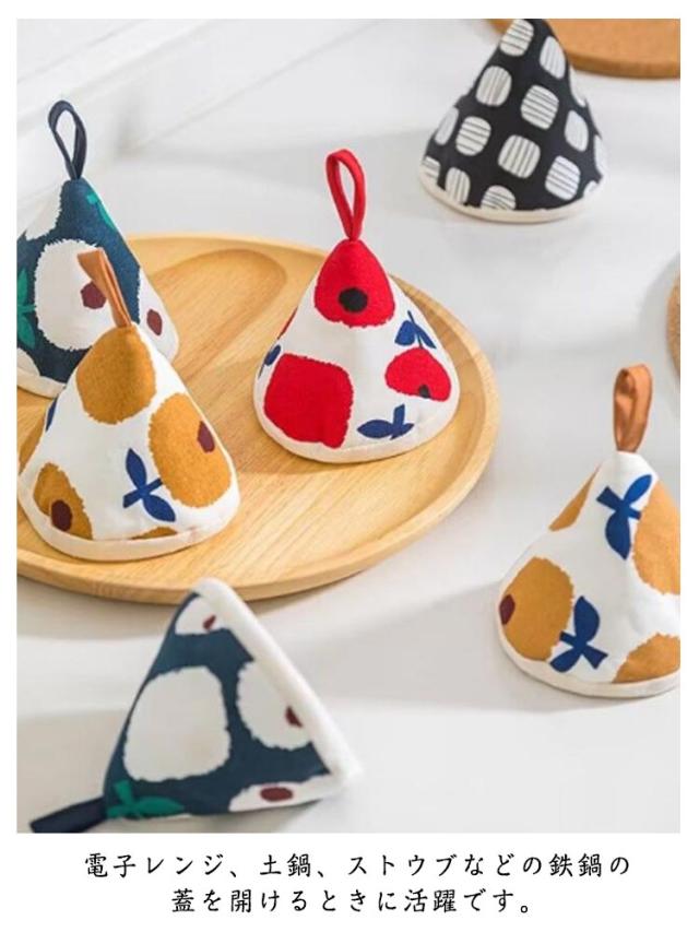 | オシャレな柄がキッチンを一層華やかに!まるで帽子のような三角形の鍋つかみです。 ふわふわの中綿入りだから、熱い鍋や食器を持つ時に手を熱から守ります。 吊り紐があるので、台所のどこにでもフックがあるところに掛けることができます。 三角形の鍋つかみが鍋の蓋や取っ手にピッタリはまり、ちょうどいいサイズ感です。 電子レンジ、土鍋、ストウブなどの鉄鍋の蓋を開けるときに活躍です。 | |