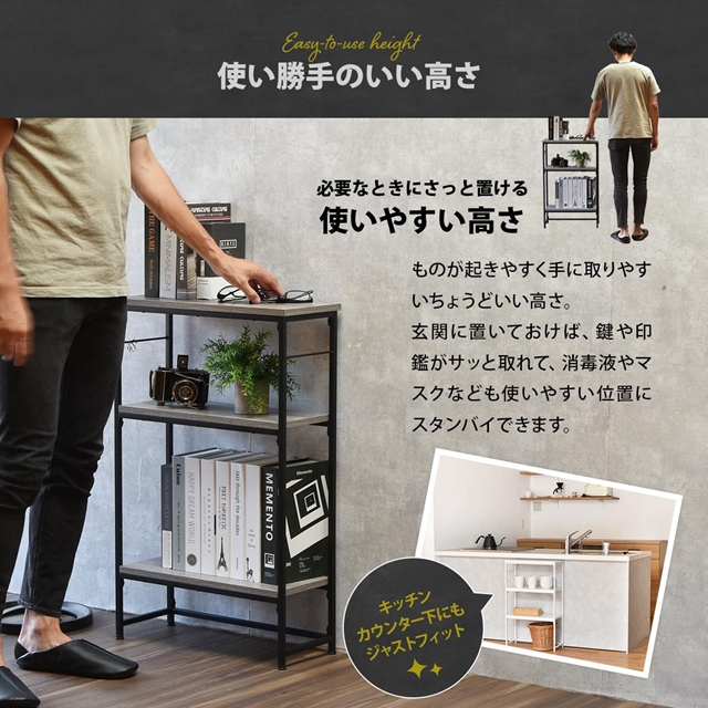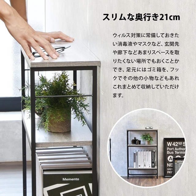 玄関や廊下など広さが限られたスペースも設置可能なスリムなラックタイプのコンソールテーブルです。棚板の取り付け位置は5か所の中からお好みに合わせて選択頂けます。シャープで圧迫感の無い落ち着いたデザインとしておりますのでリビング、キッチンカウンター下の収納、サニタリー収納等、設置場所を選ばないマルチなラックとしてご使用可能です。フレームの両サイドにはフックを引っ掛けることも可能で、フックが2つ付属しております。