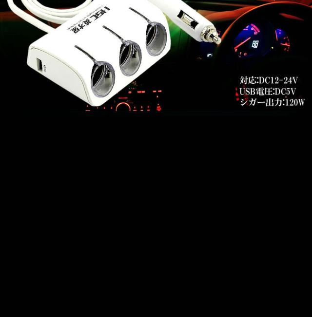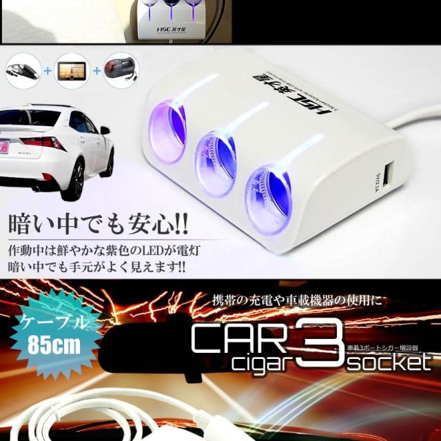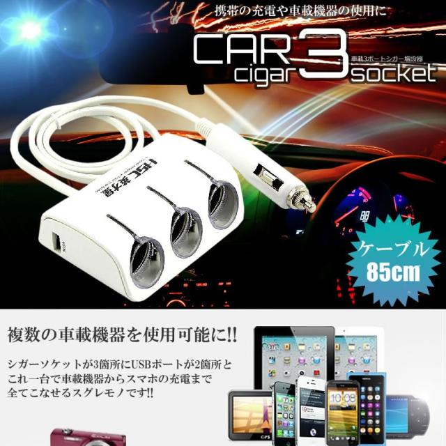 シガーソケット 増設 3連 USB 延長 85cm カーチャージャー 充電器 スマホ ドライブレコーダー FMトランスミッター タブレット 12V/24V対応 CARPA06 c0717-1a