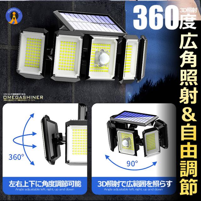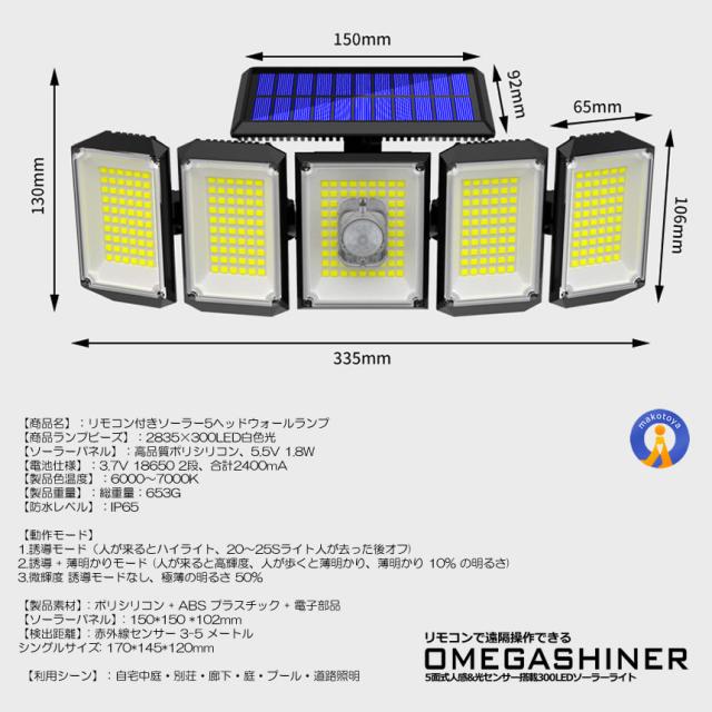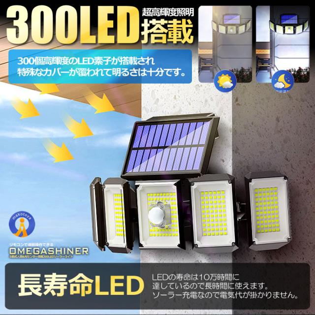 ソーラーライト 300LED 5面式 屋外 防水 センサー 明るい センサーライト リモコン付き 照明 ガーデン 庭 玄関 駐車場 高輝度 自動点灯 電源不要 OMEGA300 s-kj2211-61a