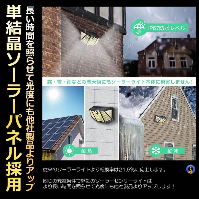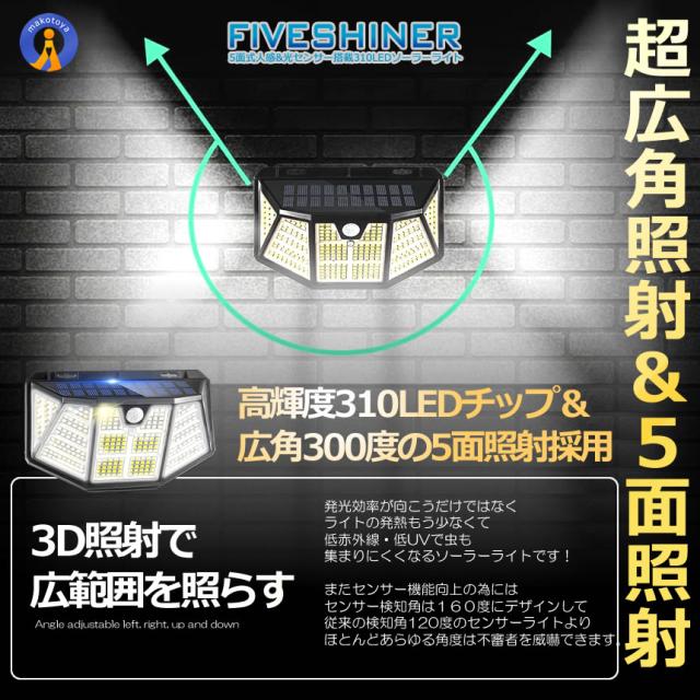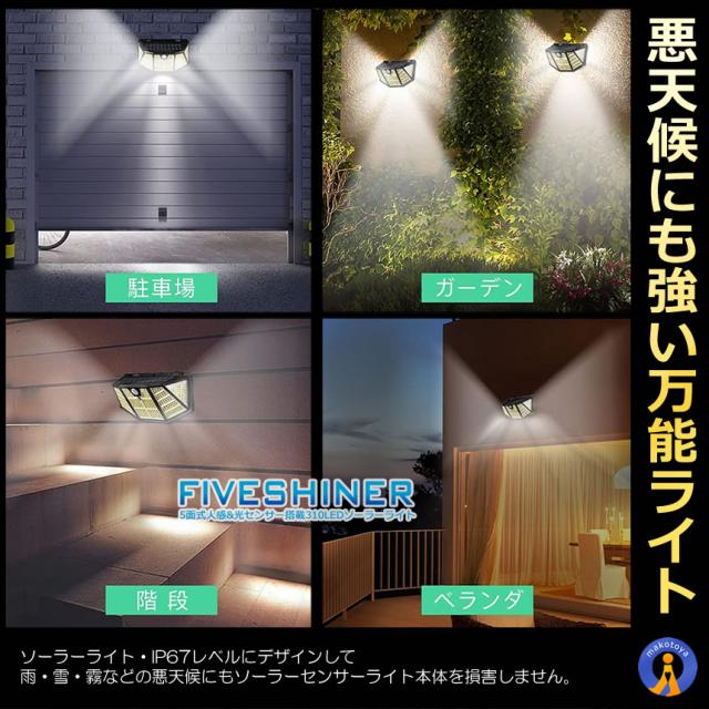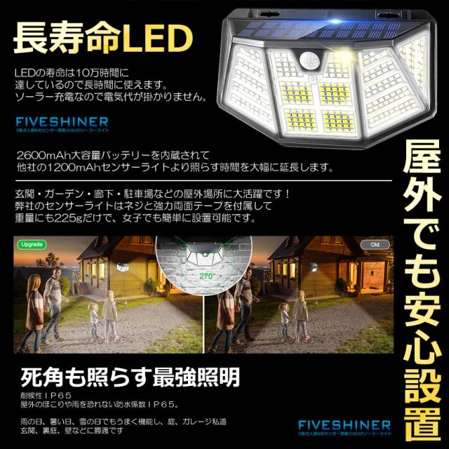 LED ソーラーライト センサーライト 自動点灯 屋外 2個セット 310LED ガーデンライト 防犯 3つの点灯モード 光センサー ガーデンライト 防犯ライト FIVESHINER s-kj2211-71a
