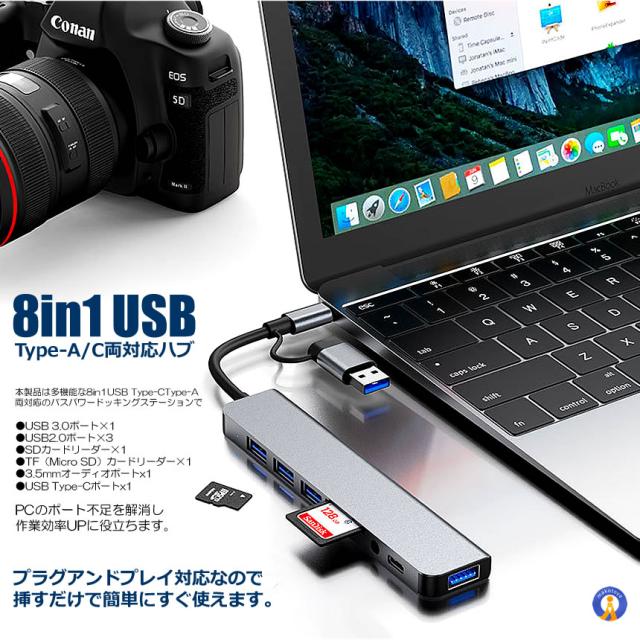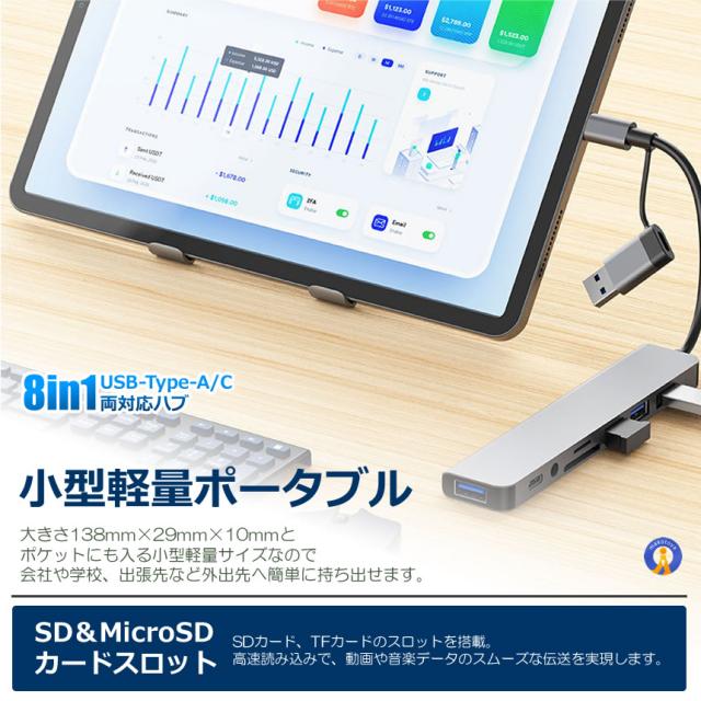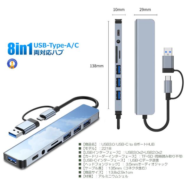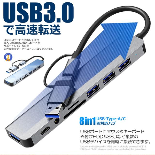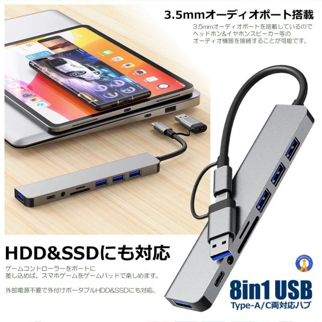 2個セット USBハブ 8in1 USB-C 3.5mmオーディオ SD microSD USB-A カードリーダー 変換アダプタ USB3.0対応 8IN1HUBSV s-kj2307-44a