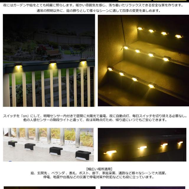 スイッチを「on」にして、明暗センサー内付きで昼間に太陽光で蓄電、夜に自動点灯、毎日スイッチを切り替える必要なし。他の人感センサーの階段ライトと違って、夜は常時点灯ため、帰り道にいつでもご安心できます。