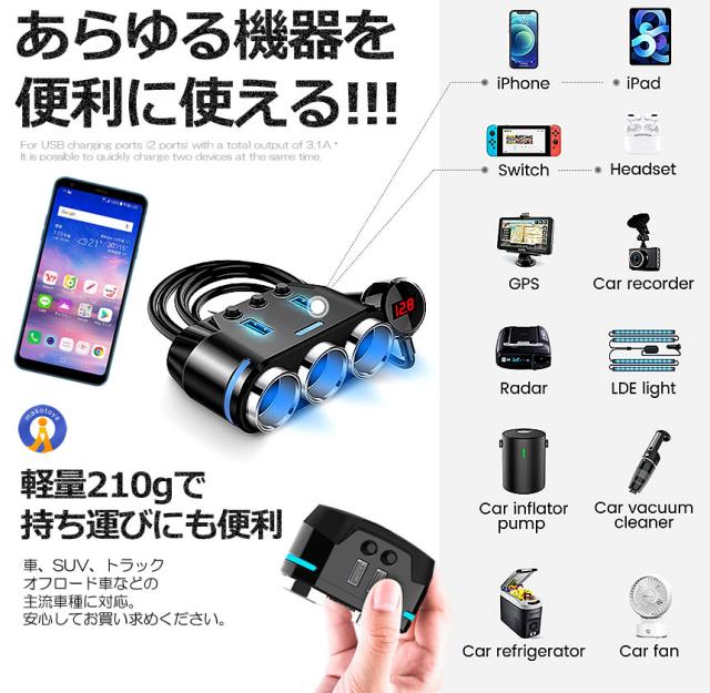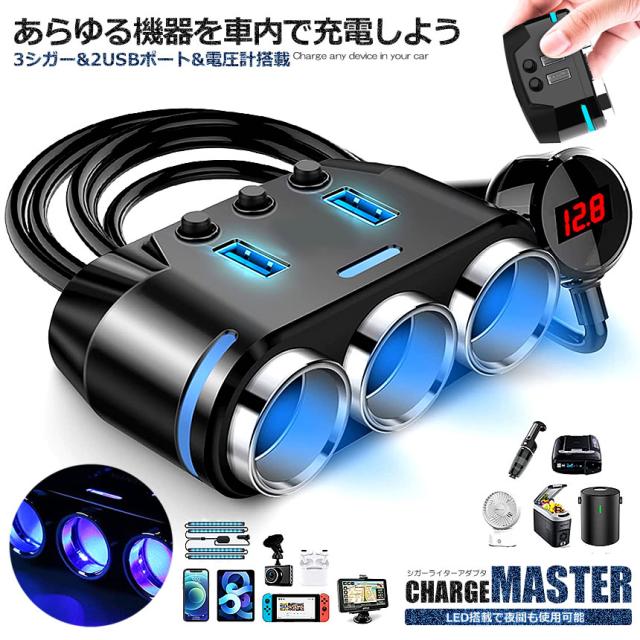 シガー増設 シガーアダプタ 12V 24V 対応 急速充電 USB 2ポート 電圧計付き LED電圧表示 ドラレコ 充電器 充電 車載 カー用品 シガーチャージャー CIGAMAST s-kj2210-52a