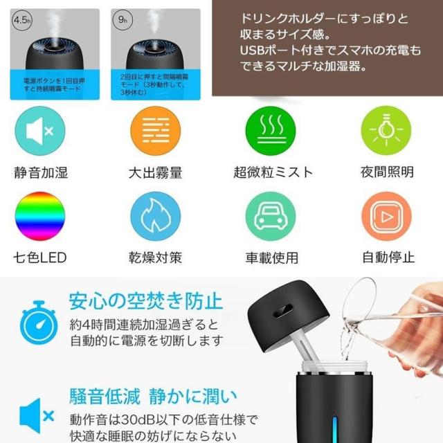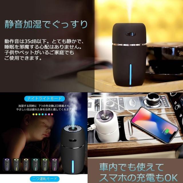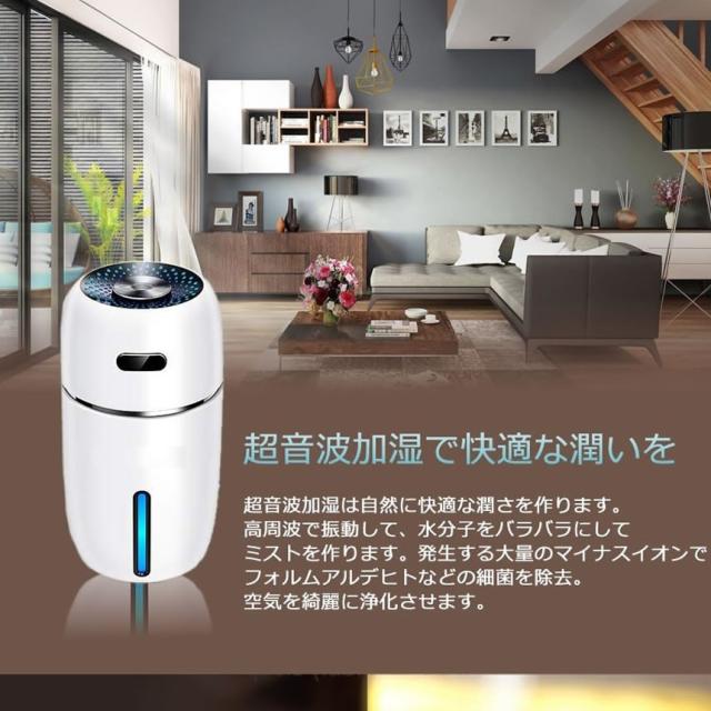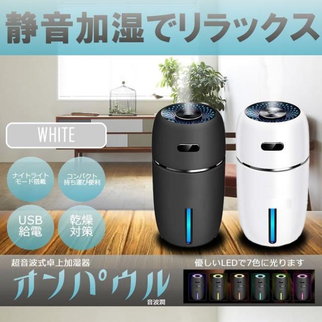 加湿器 卓上 ホワイト アロマ 超音波式 超静音 車 除菌 七色 LED ライト 小型 空気 浄化 オフィス 乾燥 花粉症 対策 コンパクト USB給電 ONAPAURU-WH mf1213-40a