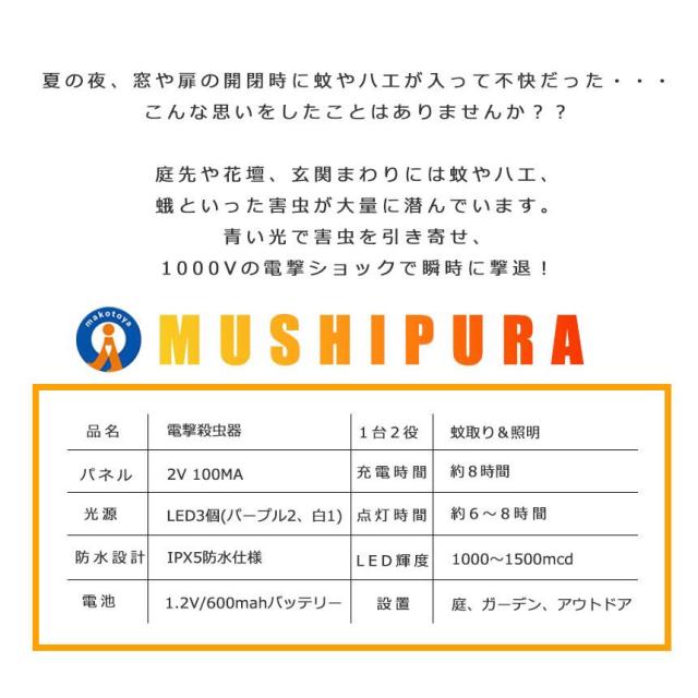 電撃 殺虫 プラズマ 2WAY LEDソーラーライト 防水 ガーデン 虫退治 誘蛾灯 UV光源吸引式殺虫器 自動点灯 蚊よけ 誘引ライト 蚊取 夏場 害虫 駆除 MUSHIPURA f0510-2a