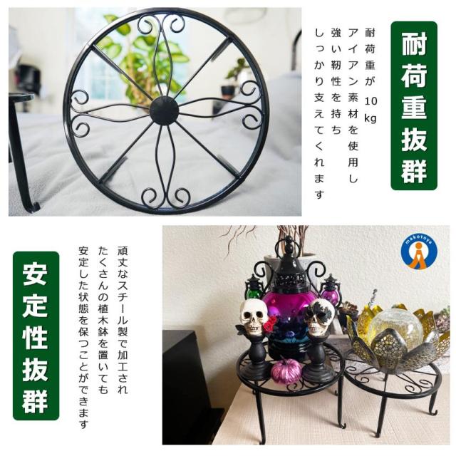 耐荷重:高品質アイアンを採用して、耐荷重30kgの頑丈仕上げのお洒落な花台です。室内に使っても屋外に使ってもアンティーク感やジャンクな風合いを演出します。