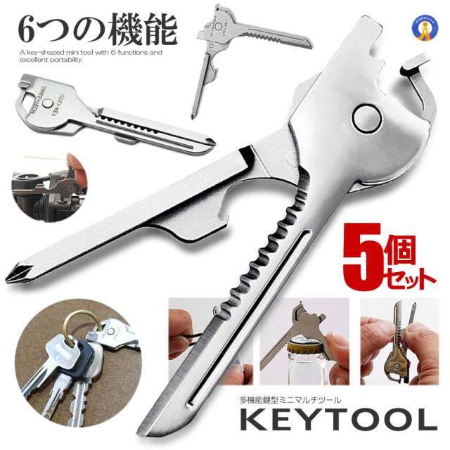 5個セット 多機能 鍵型 ミニ マルチツール 6つの機能 携帯 キーホルダー キーリング ステンレス ドライバー 栓抜き 便利 持ち運び シルバーカラー DL-KEYTUUL dl-keytuul