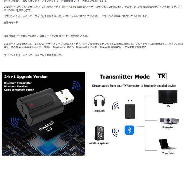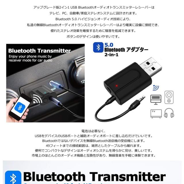 USBをデバイスのUSBポートと補助オーディオポートに差し込むだけでBluetoothではないデバイスを無線Bluetooth送信機の受信機にします。