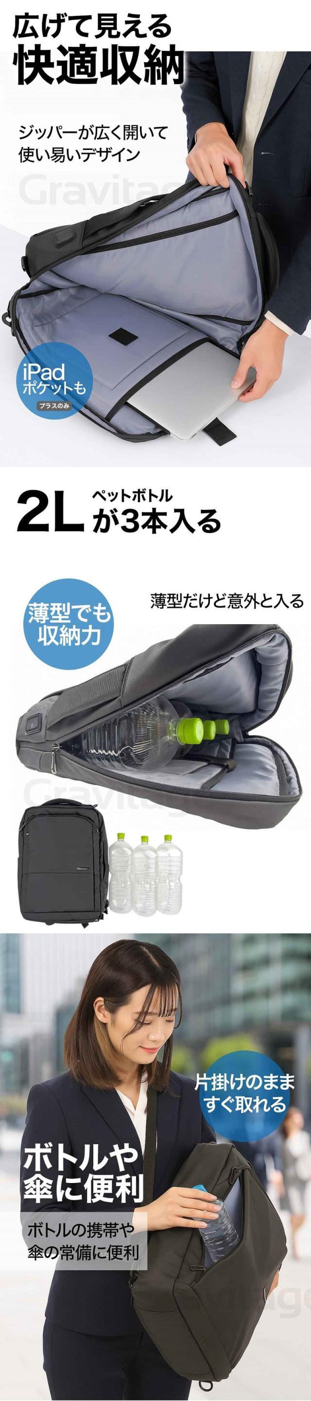 訪問先ではオフィシャルにビジネスバック(横)、通勤(通学)では両手が空いて快適なリュック(縦)として使えるマルチスタイル。スリムタイプなので車内でも邪魔になりにくい。オフィスワークに必要なパソコンと書類だけを入れて移動するのに最適。