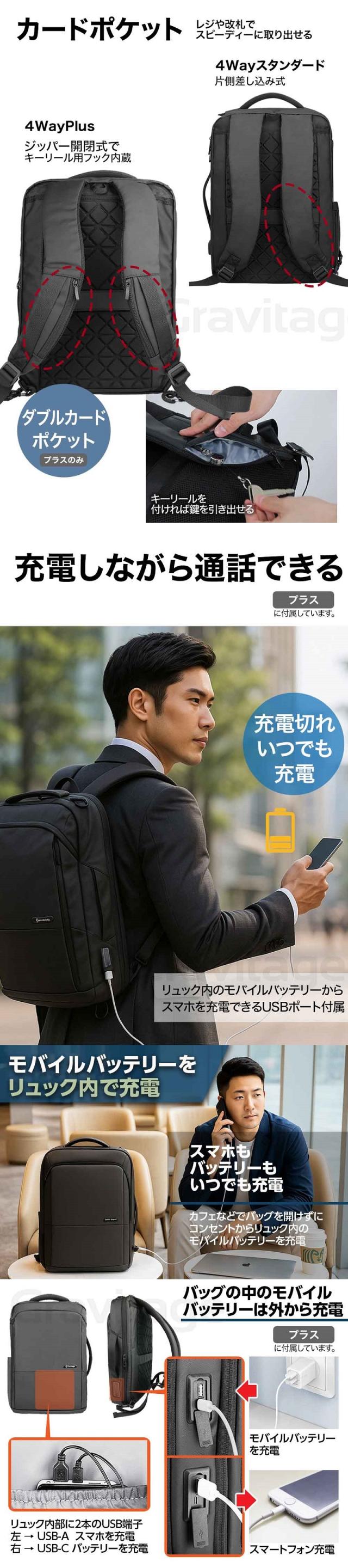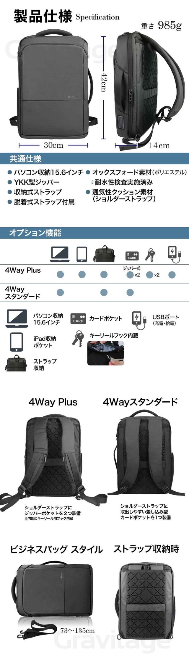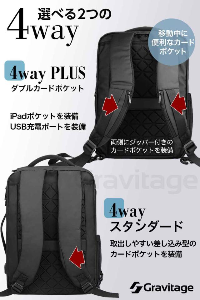 ダブルカードポケットは4Way PLUSをお選びください ![]() ※最初の画像のハートマークをクリックしてください シチュエーションに合わせて 使える4Wayスタイル 【4WAYバッグ】4WAYで活躍するビジネスリュック/ 1.バックパック 2.ショルダーバック(付属の別ストラップ使用) 3.ビジネスバック(手提げ横タイプ) 4.キャリングバッグ(手提げ縦タイプ)の 4WAYとなっています。 簡単に脱着できるショルダーベルトは裏側に収納することができ、 薄型スタイリッシュなデザインの手提げバッグになります。 正面と側面にはバッグハンドルが付いてますので、状況に応じて お好みの持ち方を選択でき、日々の通勤や出張などに活躍します! 【収納力抜群なポケットで分割収納】 1.クッション内蔵PC収納 2.スマホポケット 3.ドキュメントポケット 4.カードや筆記用具 5.ボトルポケット 小物、書類、PCと分けやすくシンプルな構造なのも特徴です。 必要なアイテムを、ひとまとめにして持ち運べます。 外側とメイン収納部は側面まで大きく開くダブルファスナーがあるので、 スムーズに出し入れ、たくさん入るスクエア型バックパックです。 【 肩・背中の負担を軽くする 】 背面は厚めのクッション材とストラップ部分にはメッシュ素材を使用しており 背面は背骨のS字に合うように設計されています。軽いので肩や背中への負担を 軽減しながら、通気性に優れていて身体にフィットする安心設計です。 幅広のストラップで重さを均一に分散し、クッション構造の背当て”で 快適な使い心地を実現しました。 【ワンアクションで楽々改札】 ショルダーベルトに作られた、取り出しやすい カードスロットで改札もスマートに通過! 【 持ち運びやすさ◎ 】 背面部分にはスーツケースとセットできる構造になっており、 持ち歩くのに便利で、出張・旅行・通勤・通学など幅広く使用できます。 【 防水・耐傷 】 表面素材は傷などがつきにくい高密度の生地を使用しており、 耐摩耗性・耐久性を実現しました。撥水加工した素材を使用し ているので、雨に強いシリーズです(水が入り込みにくく設計 されておりますが、完全防水ではございません。予めご了承ください) 【商品スペック】 ■サイズ:縦約42cm 横約30cm 厚さ約11-16cm ■重さ:約1kg ■色:ブラック(黒) ■パソコン収納:幅27cm 深さ38cm マチ2cm 父の日やお歳暮、ギフト、プレゼントとしても喜ばれています。 よくある質問 Q.4Wayと4Way PLUSはどこが違いますか? A. PLUSには次の機能がバージョンアップされています。 4Way PLUS: ・iPadポケット付属 ・トップポケットのキーストラップ付属 ・トップポケットのカードポケット付属 ・ジッパー付きのカードポケット(キーリールフック内蔵・両側) ※4Wayはジッパーが付いていない差し込み式のカードポケット(片側)になります。 Q.15.6インチのPCは収納可能ですか? A.はい、収納可能です。 Q.iPhone、Androidの充電は可能ですか? A.可能です。ただし、モバイルバッテリーに関しましては、 付属ではないのでお客様でご用意いただく必要がございます。