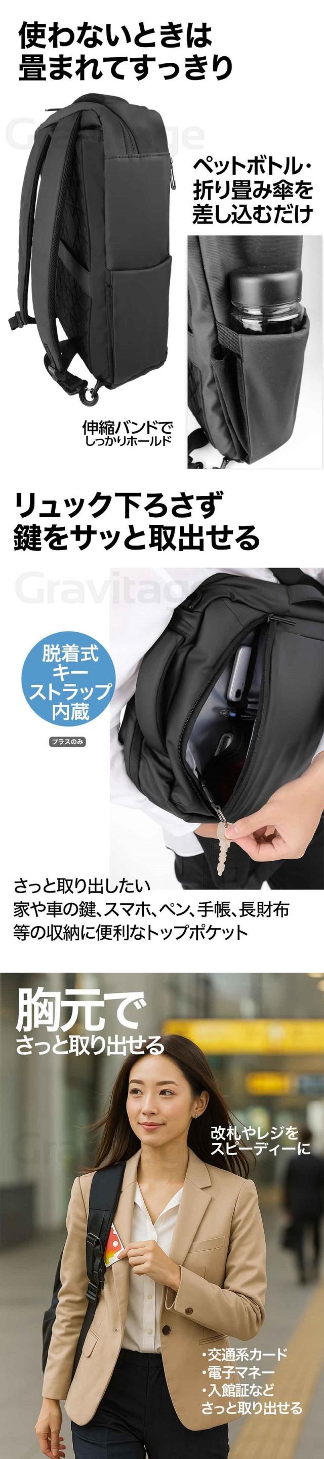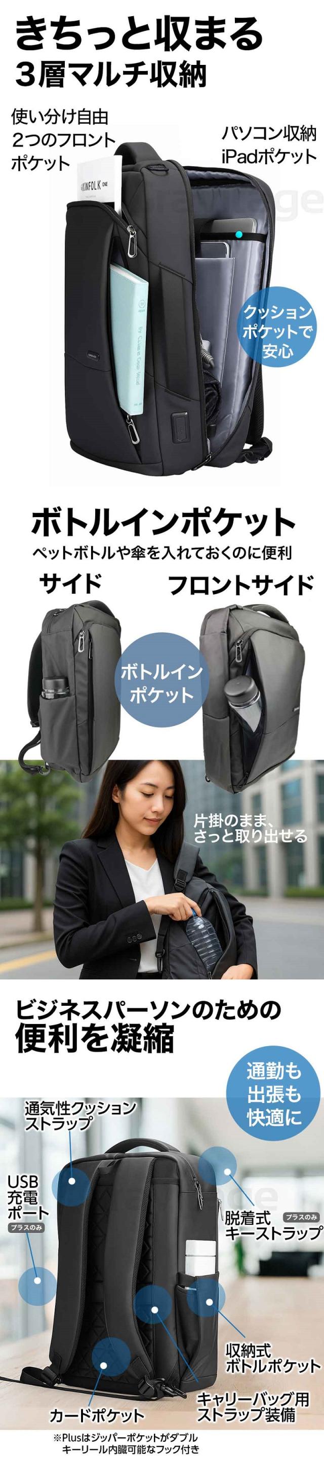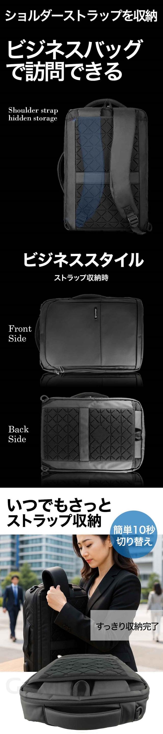 ダブルカードポケットは4Way PLUSをお選びください ![]() ※最初の画像のハートマークをクリックしてください シチュエーションに合わせて 使える4Wayスタイル 【4WAYバッグ】4WAYで活躍するビジネスリュック/ 1.バックパック 2.ショルダーバック(付属の別ストラップ使用) 3.ビジネスバック(手提げ横タイプ) 4.キャリングバッグ(手提げ縦タイプ)の 4WAYとなっています。 簡単に脱着できるショルダーベルトは裏側に収納することができ、 薄型スタイリッシュなデザインの手提げバッグになります。 正面と側面にはバッグハンドルが付いてますので、状況に応じて お好みの持ち方を選択でき、日々の通勤や出張などに活躍します! 【収納力抜群なポケットで分割収納】 1.クッション内蔵PC収納 2.スマホポケット 3.ドキュメントポケット 4.カードや筆記用具 5.ボトルポケット 小物、書類、PCと分けやすくシンプルな構造なのも特徴です。 必要なアイテムを、ひとまとめにして持ち運べます。 外側とメイン収納部は側面まで大きく開くダブルファスナーがあるので、 スムーズに出し入れ、たくさん入るスクエア型バックパックです。 【 肩・背中の負担を軽くする 】 背面は厚めのクッション材とストラップ部分にはメッシュ素材を使用しており 背面は背骨のS字に合うように設計されています。軽いので肩や背中への負担を 軽減しながら、通気性に優れていて身体にフィットする安心設計です。 幅広のストラップで重さを均一に分散し、クッション構造の背当て”で 快適な使い心地を実現しました。 【ワンアクションで楽々改札】 ショルダーベルトに作られた、取り出しやすい カードスロットで改札もスマートに通過! 【 持ち運びやすさ◎ 】 背面部分にはスーツケースとセットできる構造になっており、 持ち歩くのに便利で、出張・旅行・通勤・通学など幅広く使用できます。 【 防水・耐傷 】 表面素材は傷などがつきにくい高密度の生地を使用しており、 耐摩耗性・耐久性を実現しました。撥水加工した素材を使用し ているので、雨に強いシリーズです(水が入り込みにくく設計 されておりますが、完全防水ではございません。予めご了承ください) 【商品スペック】 ■サイズ:縦約42cm 横約30cm 厚さ約11-16cm ■重さ:約1kg ■色:ブラック(黒) ■パソコン収納:幅27cm 深さ38cm マチ2cm 父の日やお歳暮、ギフト、プレゼントとしても喜ばれています。 よくある質問 Q.4Wayと4Way PLUSはどこが違いますか? A. PLUSには次の機能がバージョンアップされています。 4Way PLUS: ・iPadポケット付属 ・トップポケットのキーストラップ付属 ・トップポケットのカードポケット付属 ・ジッパー付きのカードポケット(キーリールフック内蔵・両側) ※4Wayはジッパーが付いていない差し込み式のカードポケット(片側)になります。 Q.15.6インチのPCは収納可能ですか? A.はい、収納可能です。 Q.iPhone、Androidの充電は可能ですか? A.可能です。ただし、モバイルバッテリーに関しましては、 付属ではないのでお客様でご用意いただく必要がございます。