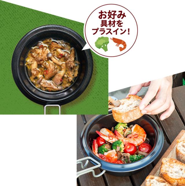 キャンプシーンで簡単に楽しめるアヒージョの素です。
