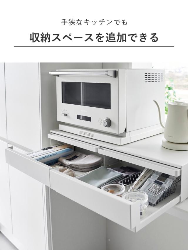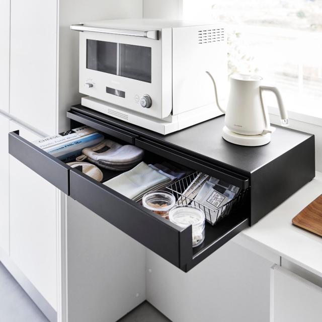 キッチン家電下に設置するだけで収納+作業スペースを増やすことができる便利なアイテムです。家電下を有効活用して設置できるので、手狭なキッチンでも手軽に収納を増やせます。引き出しにはラップやカトラリーなどキッチン小物をたくさん収納できます。