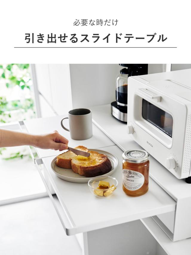 幅80cmのワイドな天板には、電子レンジと炊飯器やトースターとコーヒーメーカーなど家電を並べて設置できます。スライドテーブルは半分ずつ引き出すことができ、両方引き出せば広々と使うことができます。
