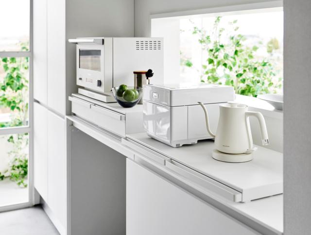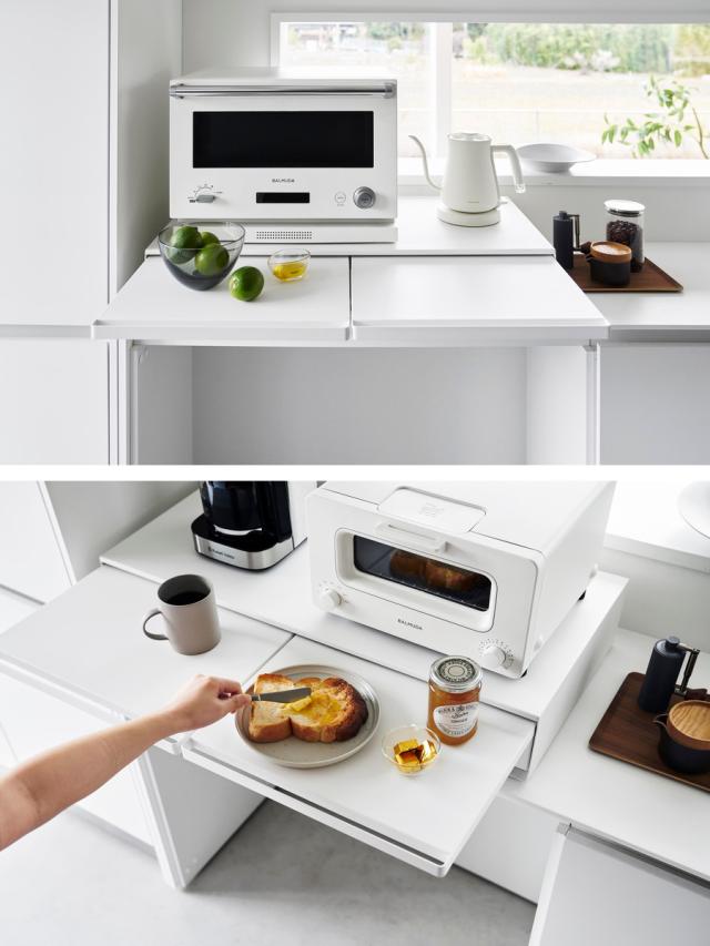 家電下のスペースが便利な作業スペースとして使えるスライドテーブルです。電子レンジ下に設置すれば温めたものの一時置きに使え、炊飯器の下に置けばご飯をよそう時に便利で幅広く活用できます。必要な時に引き出して使えるのでキッチン動線の邪魔にもなりません。