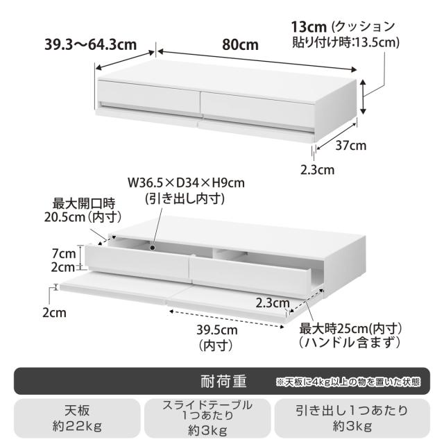 | 耐荷重 | スライドテーブル1つあたり:約 3kg(天板に4kg以上の物を置いた状態) 引き出し1つあたり:約 3kg(天板に4kg以上の物を置いた状態) |