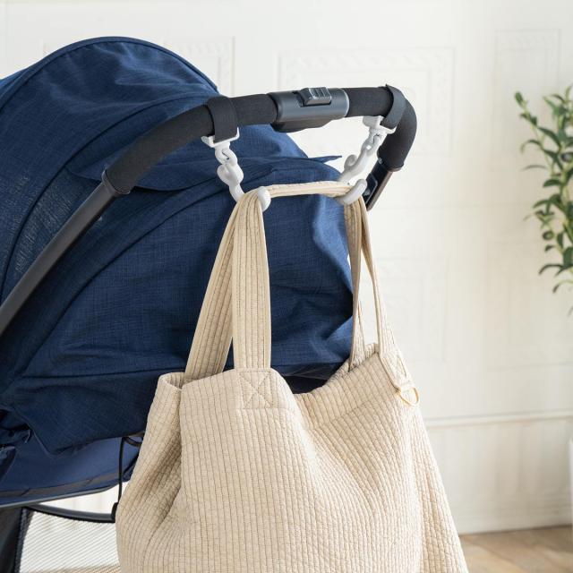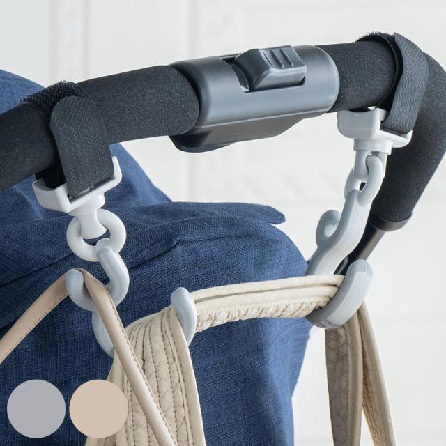 普段のお買い物やお散歩に便利な、ベビーカー用ダブルフック(2個入)です。荷物を肩掛けしなくて済むので、狭い道や店内も歩きやすくなります。