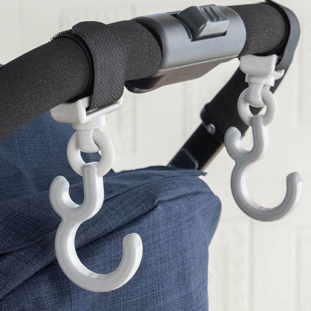 フックは360度回転可能なため、ベビーカーの向きに合わせて付け替える手間がかかりません。片手でもサッと荷物を掛けられるので、お子様を抱っこしている時も使いやすいです。