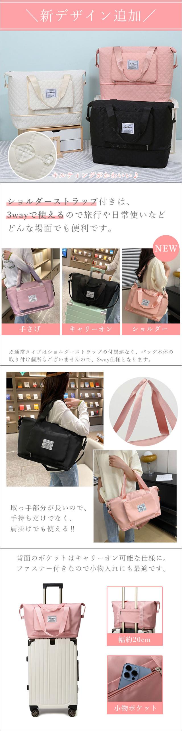 | 商品 特徴 | 【新登場のキルティングデザイン】 大人気のバッグに新しく、キルティングデザインが追加しました。 【ストラップ機能追加】 ストラップ付きは斜め掛けもできるので、手がふさがってしまう時も安心です。 【持ち運び簡単】 折りたたむとコンパクトになるので、持ち運びや使用しない時の収納にも便利です。 【荷物が増えても安心】 ファスナーを外すと容量が大きくなるので、お出かけ先で荷物が増えた時でも安心です。 【旅行にも】 後ろのポケットはキャリーバッグにかけることもできるので、旅行の際のサブバッグとしても大活躍します! 【多用途】 超軽量で撥水性のある生地なので、お出かけや旅行はもちろん、スポーツジムや温泉、プールにも最適。お子様がいる方のマザーズバッグとしてもとっても便利です☆ |