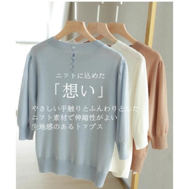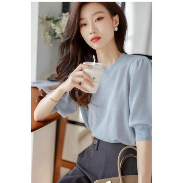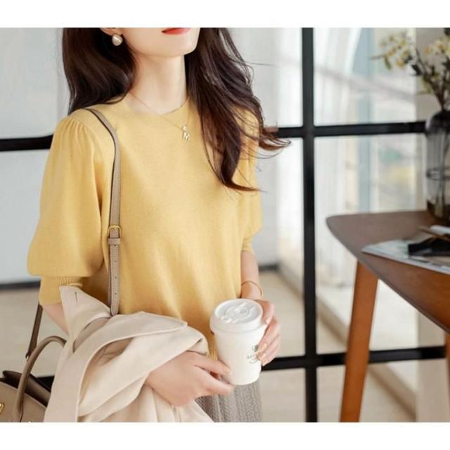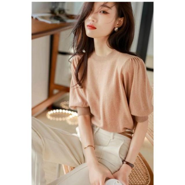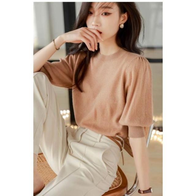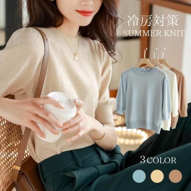 トップス パフスリーブ 二の腕カバー 半袖ニット ニット Tシャツ 五分袖 カットソー 半袖 サマーニット シンプル 涼しい 冷房対策 きれいめ オフィス カジュアル 20代 30代 40代