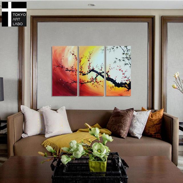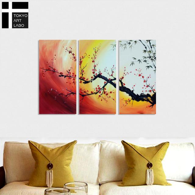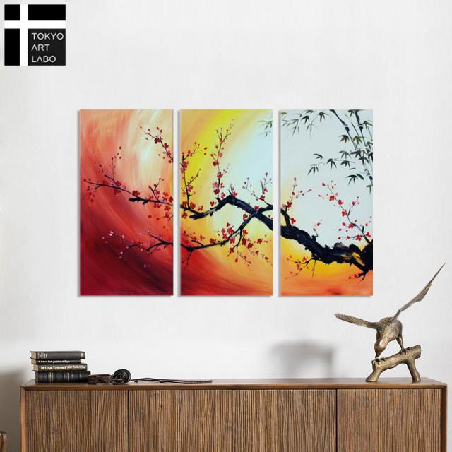 絵画 壁掛け インテリア 梅の絵 花の絵 和モダン アートパネル 油絵 風水 赤 竹梅 紅梅 W120cm 3枚組 油彩画