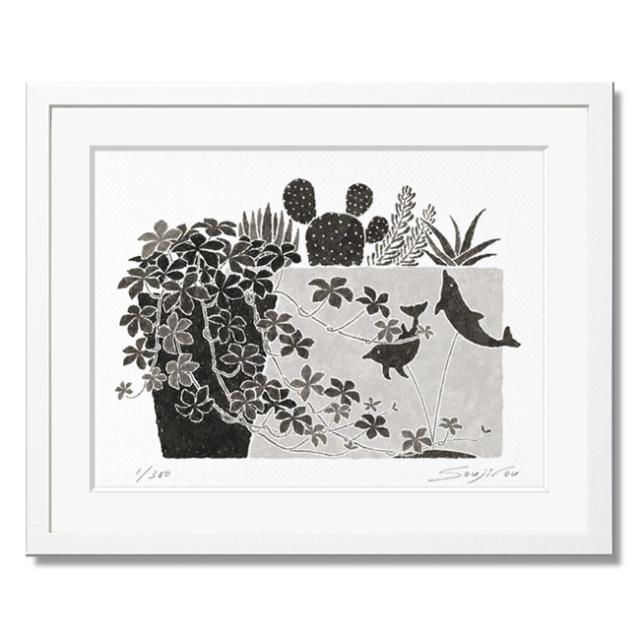 絵画 モノクロ 壁掛け インテリア シュガーバインと多肉植物とイルカの置物 白額 四切 モノトーン おしゃれ 絵 花 アートパネル モノトーン プレゼント お祝い ギフト 母の日