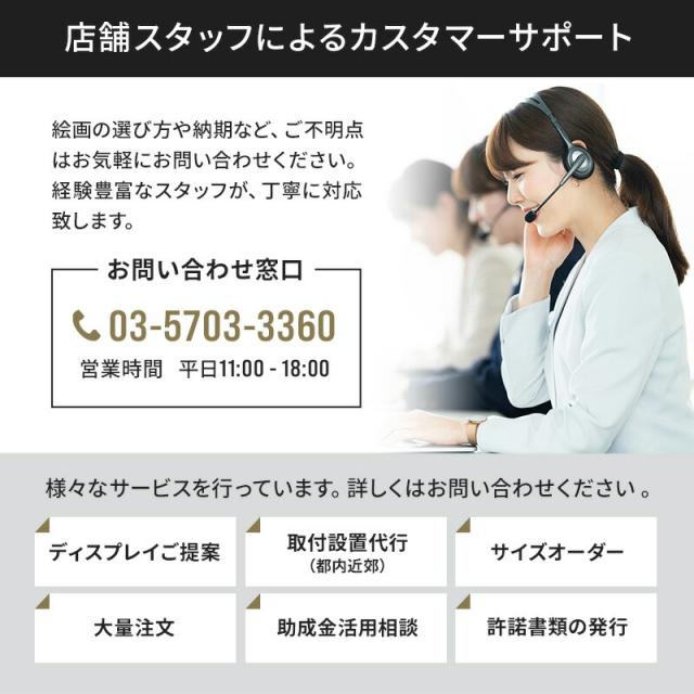 サイズ変更や額装・オリジナル制作など、オートクチュールが可能なお店ですので、アートに関するお悩みご相談にワンストップで即応致します。店舗改装 リノベ、リフォーム時期に合わせた納期相談も承りますのでお気軽にお問い合わせください。
