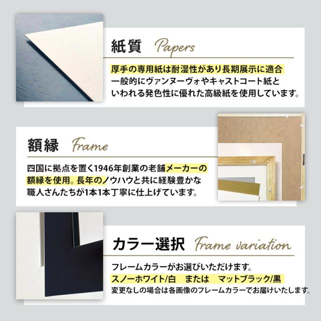この製品はジークレー印刷による高精細な描写で、質感・色調ともに空間演出に適した面種と日本製額縁(フレーム)による仕様となっています。