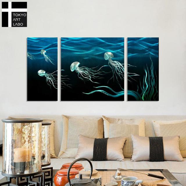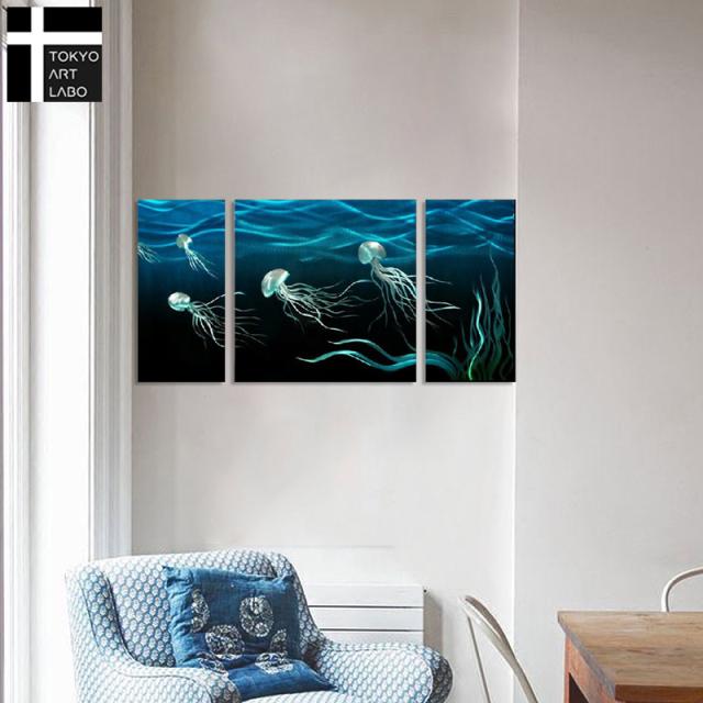 油絵 絵画 クラゲ 抽象画 海 深海 リビングの壁掛け 医療施設 宿泊施設 飲食店に飾る ディスプレイアート 3枚組 油彩画 海月 水母 ジェリーフィッシュ jellyfish